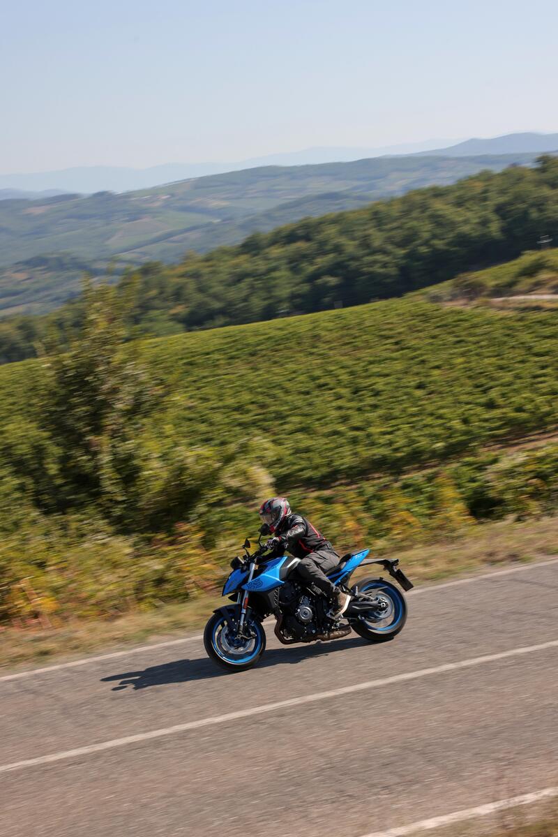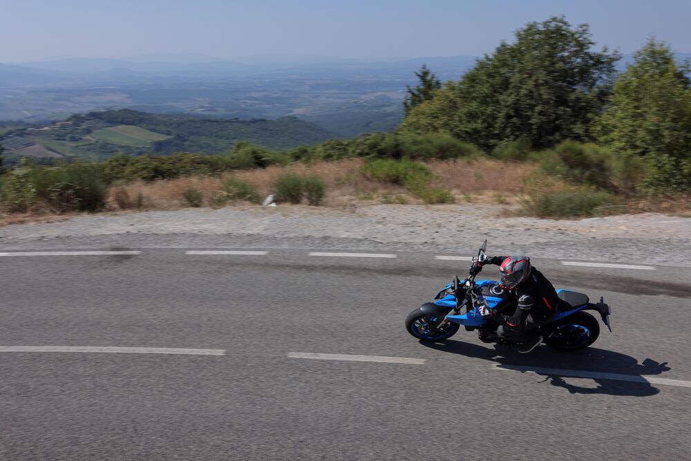 Semplice, intuitiva e divertente. In sella alla naked ci si sente subito a proprio agio e per chi si stesse chiedendo se la GSX-8S debba fare un po' di dieta dimagrante noi rispondiamo no. I 202 kg ci sono ma grazie all'impostazione di guida e alle quote ciclistiche studiate dagli ingegneri Suzuki il peso non si sente, anzi, la sensazione è quella di avere una moto molto agile tra le gambe. Impressione che si somma alla notevole stabilita dell'avantreno - supportato da una forcella a steli rovesciati - e dall'interasse abbastanza lungo per la categoria.