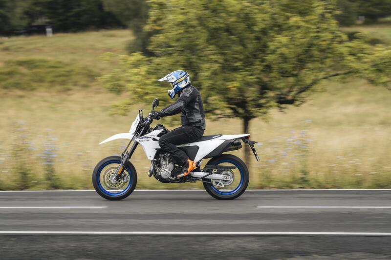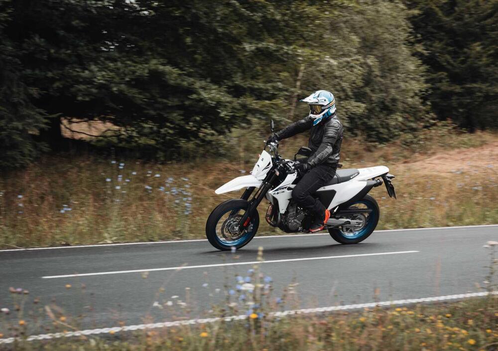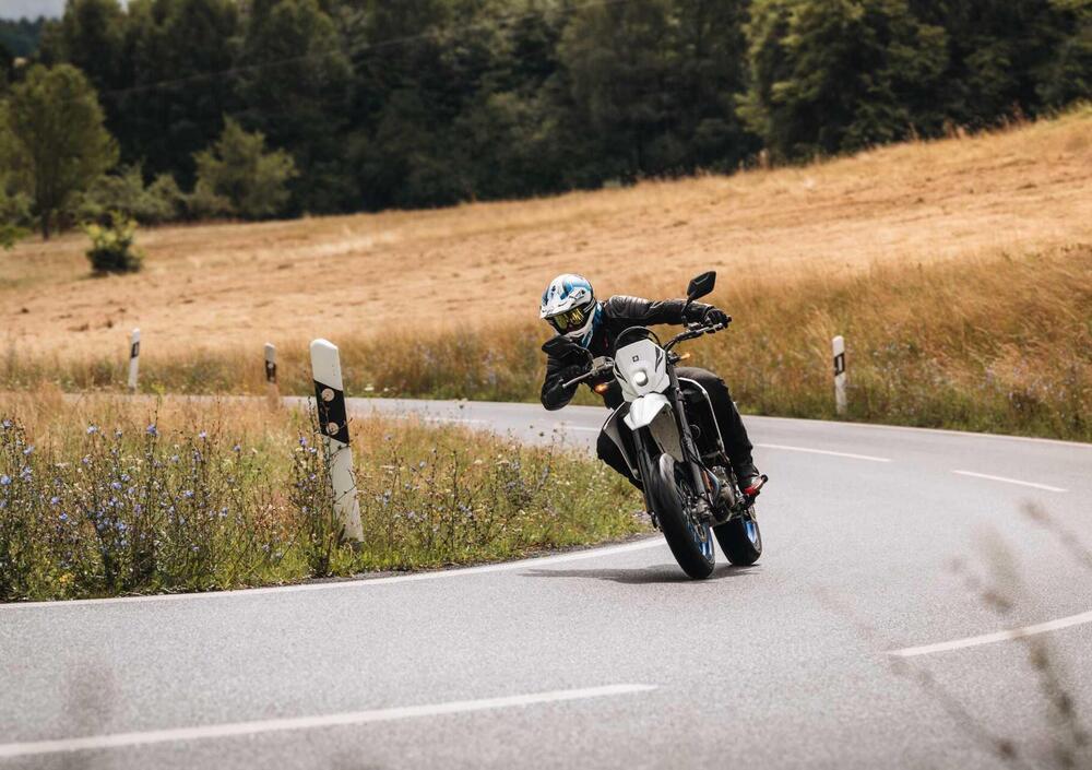 La DR-Z4 SM si presenta con una facilità disarmante, quasi come se volesse dire "fidati di me, ci penso io a farti divertire". E in effetti è proprio così: dalla prima curva si capisce di essere alla guida di una vera supermotard, una di quelle moto che non tradiscono mai le aspettative.