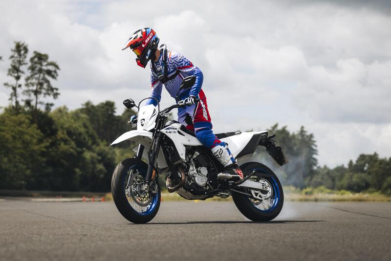 L'altezza della sella di 890 mm e la distanza da terra di 260 mm offrono una posizione di guida dominante tipica delle supermotard, mentre l'interasse di 1.465 mm e l'avancorsa di 95 mm con angolo di cannotto di 26,5° definiscono una geometria orientata alla precisione di guida.
