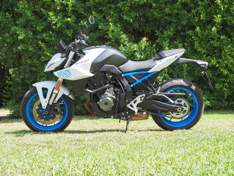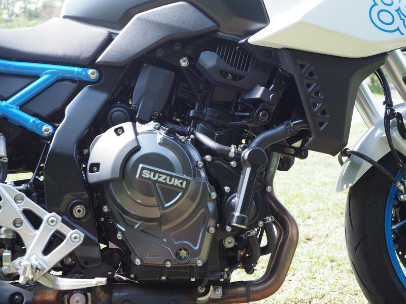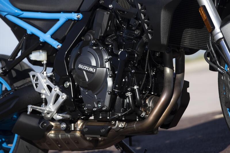 È una novità assoluta in casa Suzuki il nuovo bicilindrico in linea frontemarcia è raffreddato a liquido con 4 valvole per cilindro comandate da un doppio albero a camme in testa e vanta la fasatura degli scoppi di 270 gradi, che permette di avere un suono e un carattere più vicino a un V di 90°. La potenza massima è di 83 cavalli 8.500 giri, mentre la coppia mostra un picco di 78 Nm a 6.800 giri. Le tre mappe motore sono tutte a potenza piena ma via via più scavate ai medi regimi spostandosi dalla A verso la C, più tranquilla e adatta ai fondi viscidi.