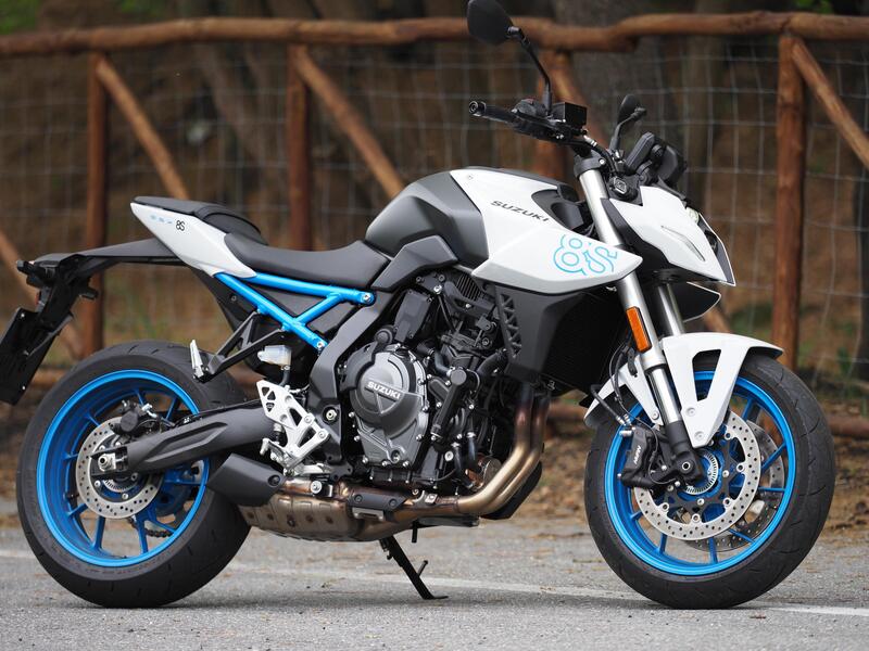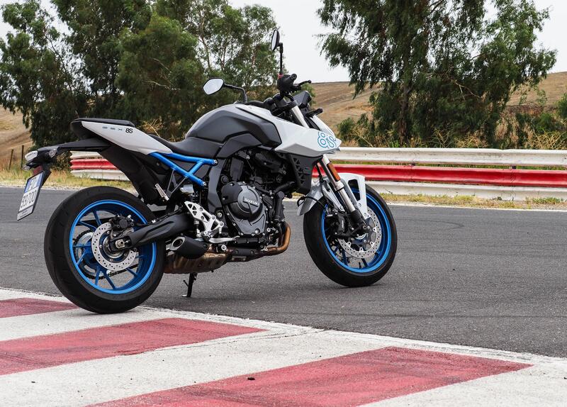 La GSX-8S nasce sulla prima piattaforma di Suzuki: vi spoileriamo che dentro il video trovate un forte indizio su cosa potrebbe essere presentato a breve contando sullo stesso bicilindrico frontemarcia di 776 cc e sullo stesso telaio in acciaio. Sul piano puramente estetico parla lo stesso linguaggio che abbiamo visto inaugurato con la GSX-S1000, sopratutto sulla parte anteriore, ed è una moto che va osservata dal vivo sia per cogliere sia la solidità delle finiture e delle verniciature, che per apprezzarne le proporzioni e la personalità estetica. Bella, a nostro modo di vedere, la colorazione bianca dell'esemplare in prova che mette in splendido risalto il colore azzuro del telaietto posteriore e dei cerchi.