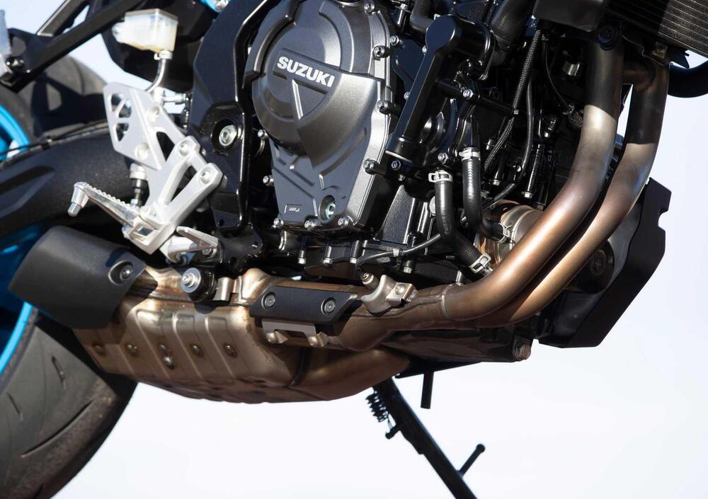 Il nuovo motore è molto compatto: questo innanzitutto per permettere lo sviluppo della piattaforma su altri modelli (alla nostra domanda “quali?” è seguito un divertito “no comment” da parte dei tecnici e manager giapponesi); peculiarità del nuovo motore, accanto al rivestimento SCEM dei cilindri, è l'introduzione del Suzuki Cross Balancer: è un sistema brevettato applicato per la prima volta su una moto di serie e mira ad abbattere le vibrazioni del primo ordine mantenendo la compattezza strutturale; funziona attraverso due contralberi (uno per cilindro) a 90° rispetto all'albero motore, la cui azione viene poi irrobustita negli effetti dalla fasatura a 270° dell'albero motore che agisce sulle vibrazioni del secondo ordine.
