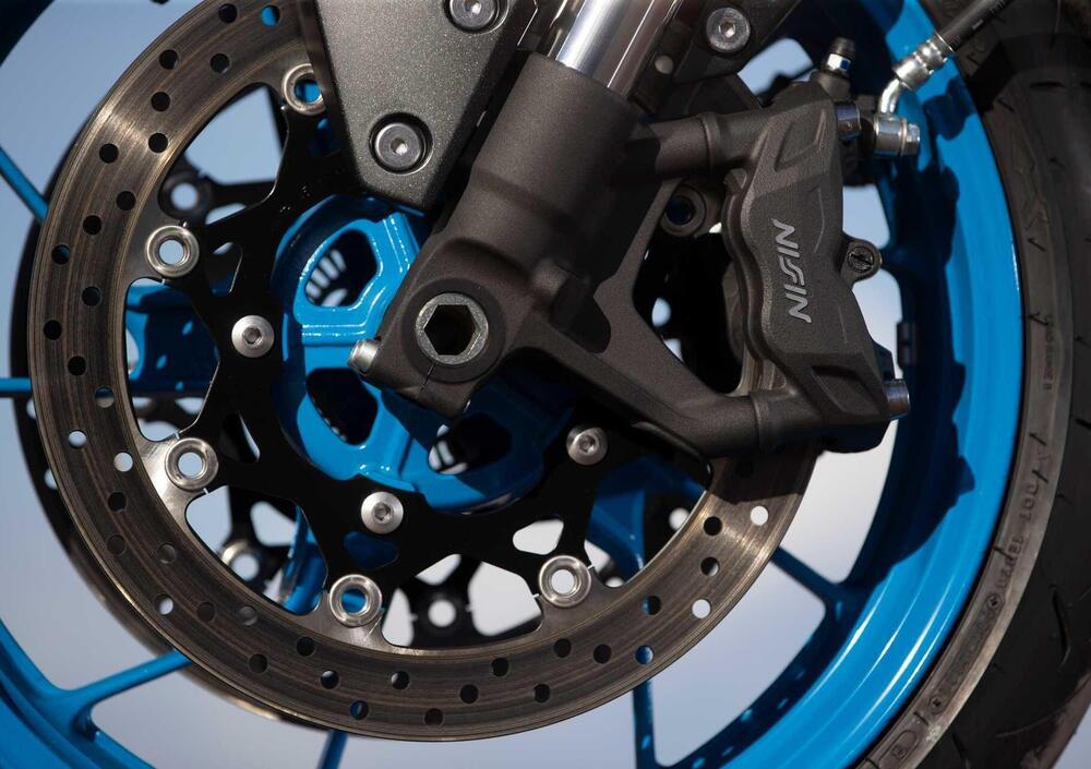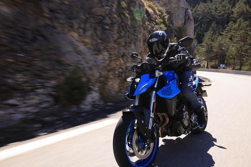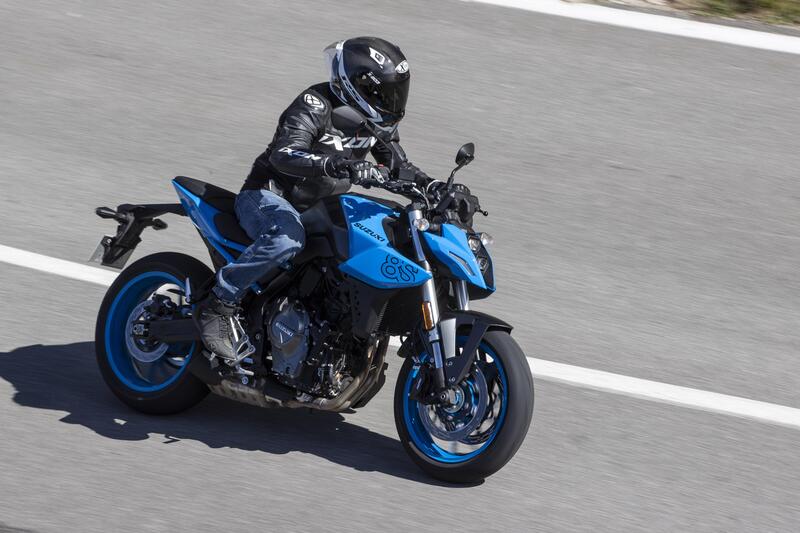Per l'interasse si è scelta una misura non contenutissima per una naked - 1465 mm – ma per giudicare la dinamica di una moto spesso è meglio dimenticarsi dei numeri e affidarsi alle sensazioni di guida. Di fatto questa lunghezza di interasse è superiore sia a quella della GSX-S1000 (1460 mm, che ha anche un forcellone di misura praticamente identica a quella della GSX-8S: 588 mm contro 587 per la 800 cc) che a quella della GSX-S750 (1455 mm) con un'avancorsa di 104 mm e il cannotto di sterzo inclinato di 25°.