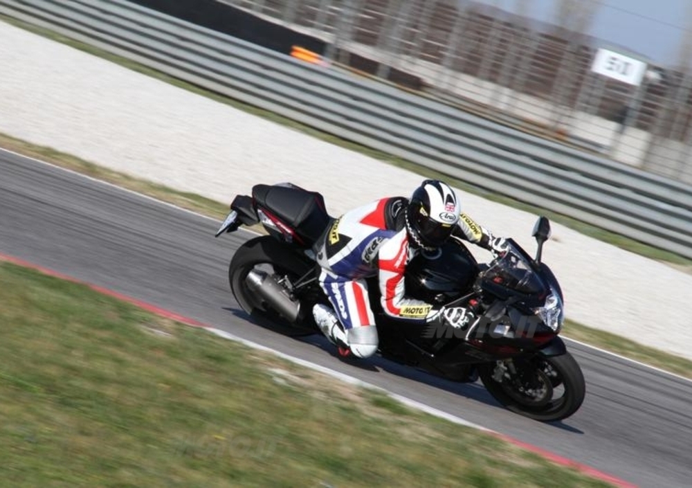 Le Brembo lì davanti fanno un gran bel lavoro, anche se la leva dopo un paio di giri tirati ha bisogno di una registrata, visto l'evidente allungamento della corsa. Fatto questo il rendimento rimane costante dall'inizio alla fine della prova, e si può contare su un feeling ottimo e su una potenza frenante limitata solo dal grip non proprio eccezionale, almeno in pista, del pneumatico anteriore. Ottimo il comportamento dell'antisaltellamento, poco invasivo e molto lineare nell'intervento, così come l'ammortizzatore di sterzo, davvero poco sollecitato (almeno su questo tracciato).