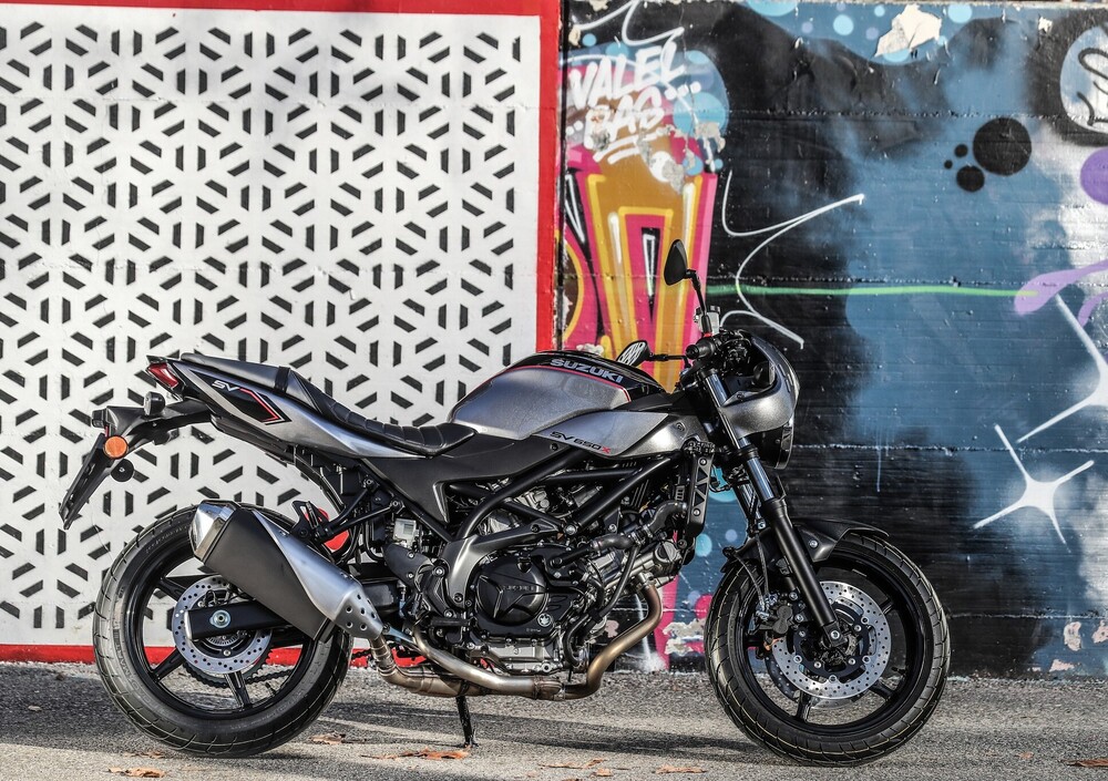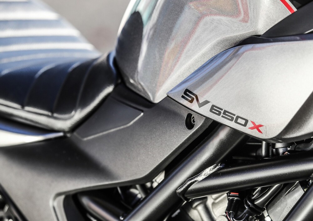 Il motore della SV650X è abbracciato da un telaio a traliccio in acciaio. Per quanto riguarda la ciclistica, sono presenti una forcella a steli tradizionali regolabile nel precarico e un monoammortizzatore al posteriore. Doppio disco anteriore flottante da 290 mm con pinze a due pistoncini all’anteriore e, dietro, singolo disco da 240 mm, formano l’impianto frenante affiancato dall’ABS, naturalmente di serie.