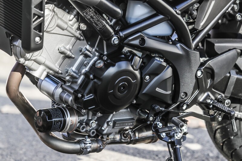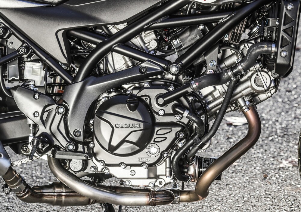 Come vi abbiamo anticipato, sotto le carene si nasconde l’amata SV650: il propulsore è un bicilindrico V-Twin raffreddato a liquido da 645 cc (alesaggio x corsa: 81 x 62,6 mm). La potenza tocca i 76 CV a 8.500 giri/min, mentre la coppia è di 64 Nm a 8.100. Inoltre, Suzuki offre la possibilità di avere la versione depotenziata da 35 kW per i possessori di patente A2. Lo scarico, posto sul lato destro, assicura l’omologazione Euro 4. Per completare il pacchetto sono presenti di serie anche il Suzuki Easy Start System, che permette di avviare il mezzo con un rapido tocco, e il Low RPM Assist, che in fase di rilascio della frizione alza di poco il numero di giri per facilitare la ripartenza da fermi.