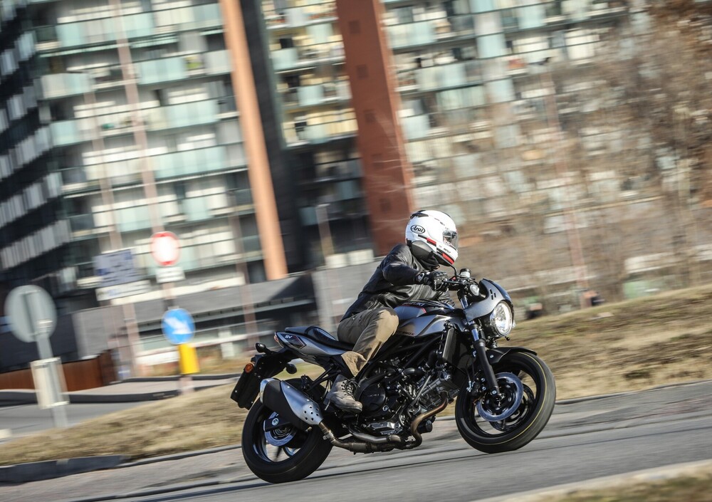 Una moto, questa, per tutti e per tutti i giorni: nel traffico è bella stretta grazie ai semi-manubri e il motore ha una buona spinta già dai bassi regimi (il Low RPM Assist aiuta nelle partenze anche chi è alle prime armi). È incredibile come il motore, per essere un bicilindrico a V, non strappi mai anche nelle marce più lunghe. La risposta dell’acceleratore è molto morbida, e ai bassi le vibrazioni sono quasi inesistenti: si sente solo pulsare il cuore della SV650X. L’unica cosa che non ci è piaciuta è la posizione degli specchietti retrovisori, molto bassi e arretrati: si possono aprirne le bacchette in avanti, a discapito però dell’estetica.