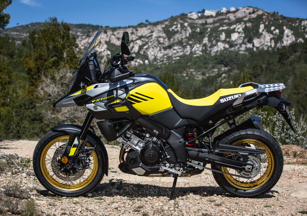 La Suzuki V-Strom 1000 conferma quindi l'ottima ciclistica, basata sul solido telaio in alluminio con cerchi da 19 e 17", e il motore a V di 90° di 1.037 cc con 100 cavalli a 8.000 giri e una robusta coppia di 101 Nm a soli 4.000 giri. Da quest'anno troviamo un nuovo frontale, con un becco più appuntito e sportivo, che si ispira alla bellissima Suzuki DR Big che correva nella Parigi-Dakar. Il bicilindrico diventa Euro 4 e ci sono anche importanti novità alla voce freni. L'impianto frenante sfrutta sempre le poderose pinze a quattro pistoncini ad attacco radiale Tokiko, che mordono dischi da 310 mm. Dietro c'è invece un bel discone da 260 mm. La novità sta nella presenza della piattaforma inerziale e della centralina Bosch, che consentono al sistema di modulare al meglio la potenza frenante anche in piega, introducendo quindi di fatto il sistema di controllo della stabilità in frenata. Non finisce qua, perché la Suzuki V-Strom 1000 ha ora anche la frenata combinata: con la leva di destra sul manubrio si mordono i dischi davanti, ma anche quello dietro. Col pedale del freno posteriore si agisce solo sul disco singolo. Di solito non siamo estimatori delle frenate combinate, ma questa funziona molto bene, migliorando l'assetto in frenata senza per questo disturbare nella guida sportiva. L'ABS, come da prassi nipponica, non può essere escluso. Di fatto è possibile farlo, togliendo il fusibile dedicato all’ABS, ma vi assicuriamo che funziona in modo efficace anche sugli sterrati. E' invece escludibile il controllo di trazione, che prevede due livelli di intervento selezionabili dal pilota.