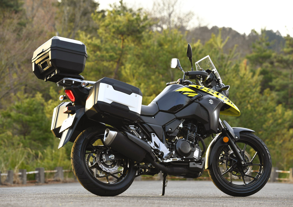 La Suzuki V-Strom 250 è una moto dalla presenza “importante”, con un design che richiama alla mente la celebre DR-Big di fine anni ottanta, con il suo mitico becco. I materiali e le finiture in generale si possono definire solidi più che accurati, mentre la dotazione appare allineata a quanto offre la concorrenza. Pratica e utile la presa 12V presente sul lato sinistro del cruscotto, perfetta per ricaricare lo smartphone o per alimentare un navigatore GPS. Già, perché seppur di cilindrata contenuta, la V-Strom 250 pensa in grande, e non si tira indietro quando si parla di viaggiare e macinare chilometri. Accessoriata con un set di bauletti, borsa da serbatoio e cavalletto centrale, infatti, la piccola crossover di Hamamatsu può trasformarsi in una viaggiatrice instancabile.