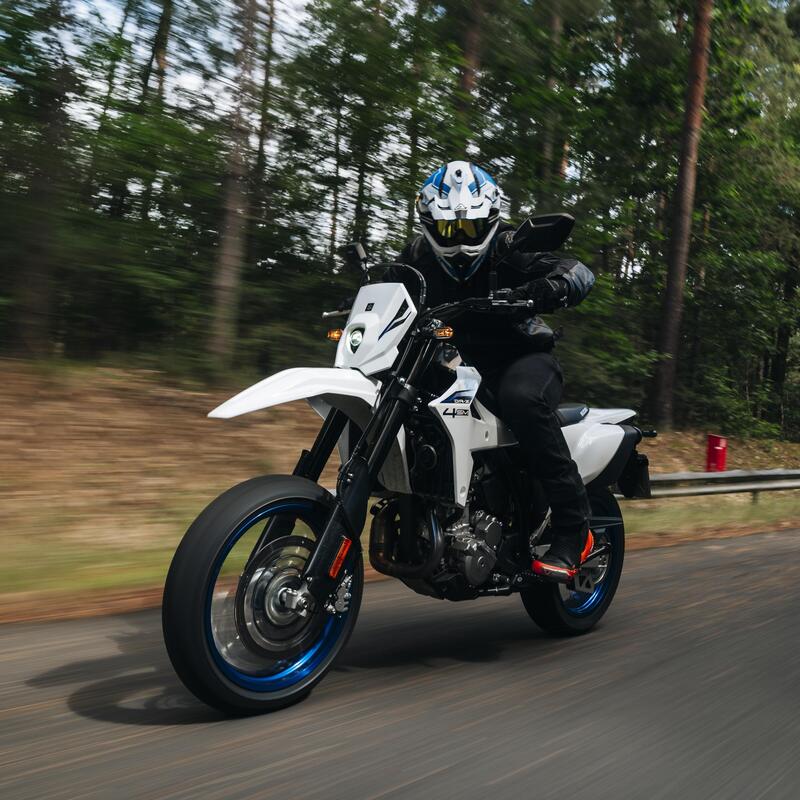 Salire in sella alla SM 125 R significa entrare immediatamente nell'atmosfera delle supermotard autentiche. La posizione di guida è decisamente dominante, con un manubrio largo che ricorda le origini enduro del DNA SWM e pedane posizionate in modo da favorire una guida attiva e coinvolgente. Non siamo di fronte a una moto "morbidona" come altri competitor del segmento: qui l'assetto è dichiaratamente racing.