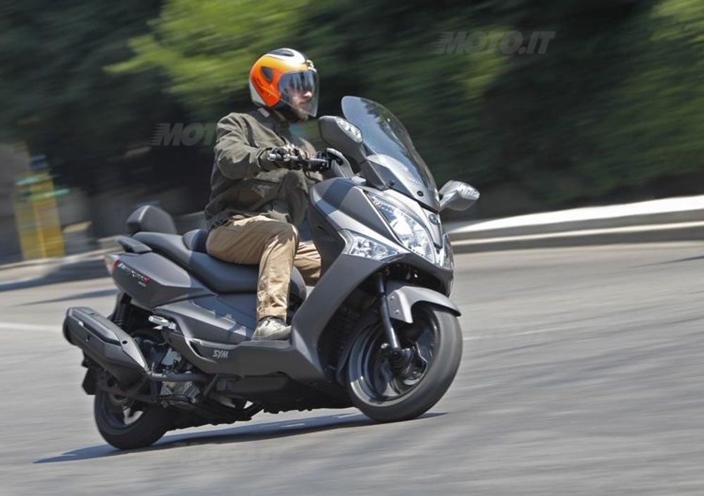 La dotazione di bordo comprende ovviamente anche due generosi maniglioni per il passeggero, tra i quali è fissato un comodo schienalino. Quanto agli accessori, il catalogo SYM cita solamente un parabrezza maggiorato e la struttura di supporto per un eventuale bauletto. Una chicca sempre apprezzabile, secondo noi, è la presenza della valvola angolata a 90° sul cerchio posteriore, che consente di gonfiare la gomma senza problemi.