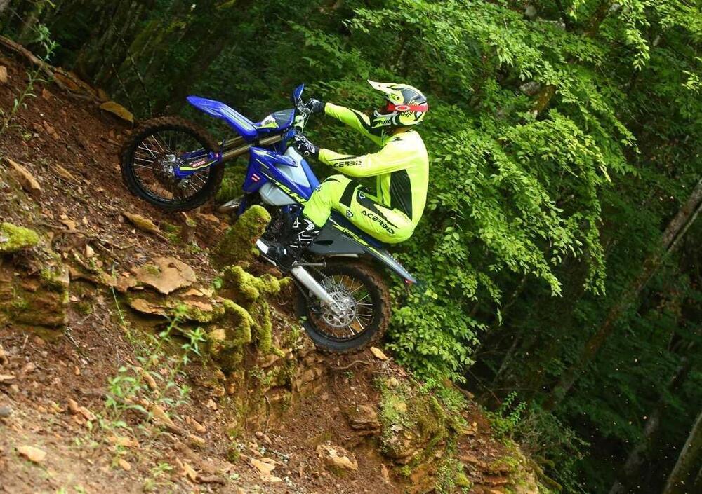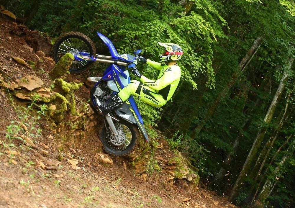 SEF 300: si parte con il trecento a quattro tempi, la loro top di gamma, sia in termini di prestazioni che anche in termini di vendite. Con il terreno molto fangoso e bagnato dalla pioggia del giorno precedente, bisogna essere super delicati e precisi e devo dire che con questo motore è abbastanza semplice perché hai un'ottima erogazione sotto, quindi puoi giocare con una marcia anche abbastanza lunga, ma allo stesso tempo i nuovi supporti delle camme hanno consentito ai tecnici di portare i giri motore fino ai 14.000 che dona uno spettro di utilizzo molto ampio a questa moto.