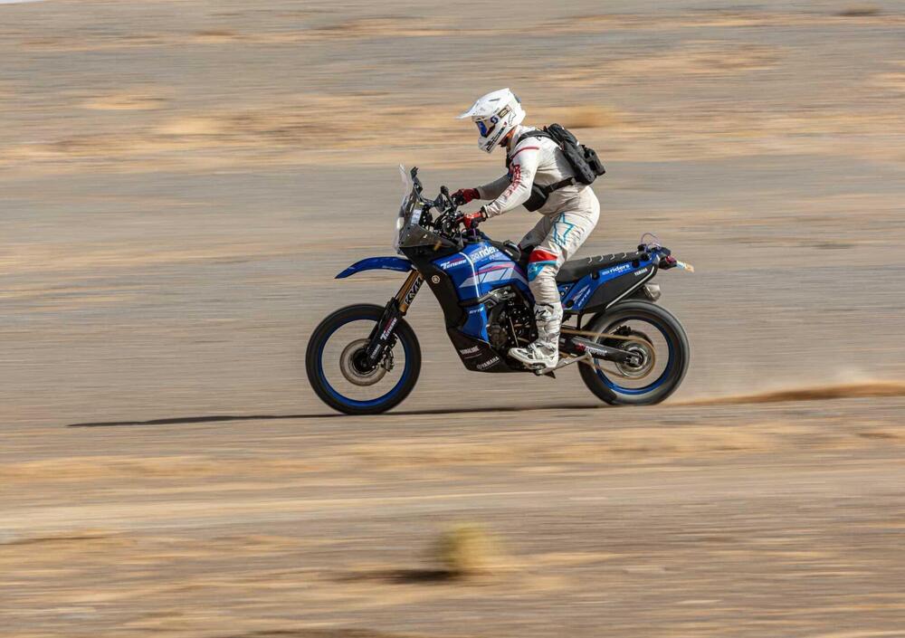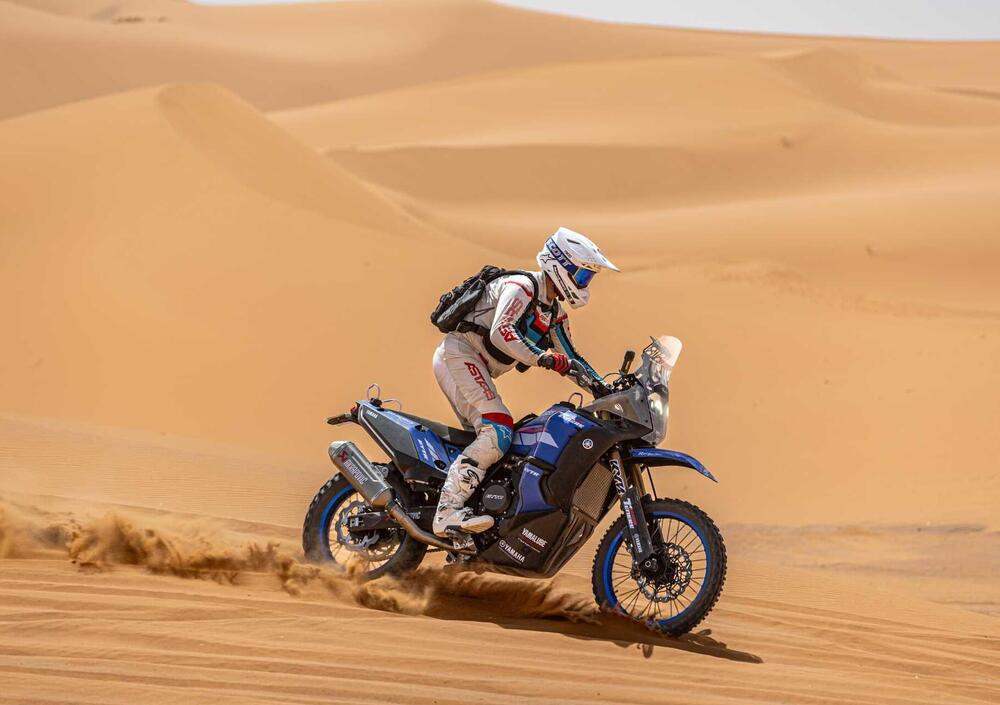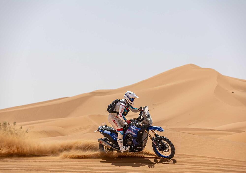 Torniamo alla Ténéré 700 GYTR. Coi serbatoi pieni, a bassa velocità nella sabbia, richiede impegno e forza fisica. D'altra parte nelle gare africane tutta quella benzina serve eccome. Basta superare i 50 km/h per scoprire una Ténéré mai vista prima: stabile, irreprensibile, vola su dossi e sabbia senza uno sbacchettamento. Un Frecciarossa nel deserto. Più osi, più lei ti asseconda con un rigore fenomenale. Non è semplicemente una Ténéré 700 trasformata, è proprio un'altra moto dove il terreno si fa difficile.