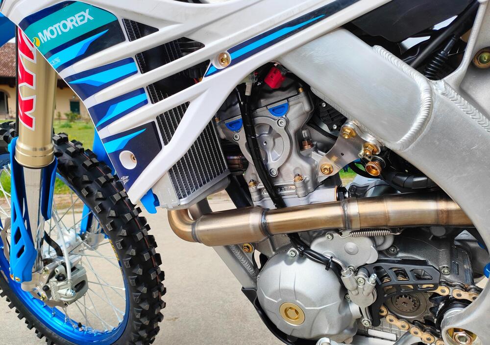 Ma torniamo alla MX 250Fi oggetto della nostra prova. Rivisto anche nell'iniezione e nello scarico il motore 4 tempi con iniezione elettronica, 2 mappe, avviamento elettrico e a pedale. Il serbatoio è ancora sotto la sella, mentre il telaio è in alluminio. La forcella è Kayaba a molle (non ad aria) e il mono è realizzato internamente da TM, che fa quasi tutto: motore, telaio, mozzi, piastre forcella, persino il mono e lo scarico doppio! I freni hanno pinze Brembo davanti e Nissin dietro, con dischi Galfer. La frizione ha il comando idraulico Brembo. I cerchi, anodizzati blu, arrivano dal Giappone e sono gli ottimi Takasago Excel.