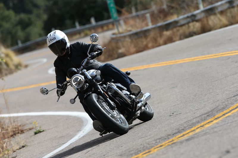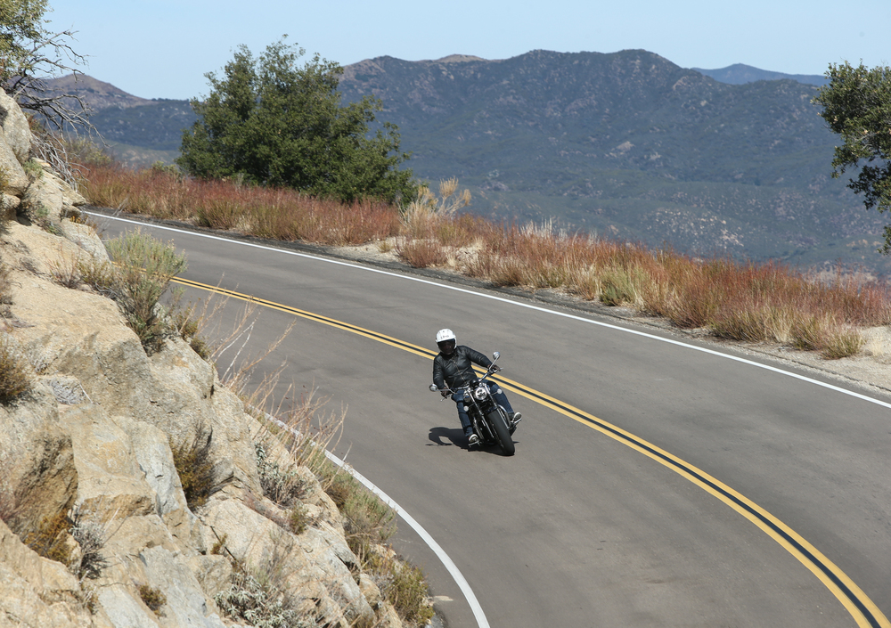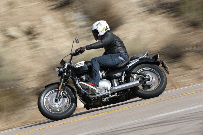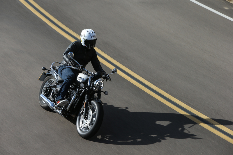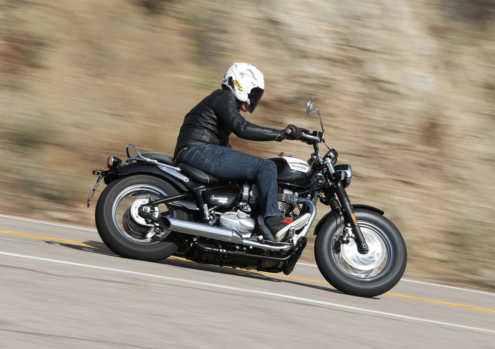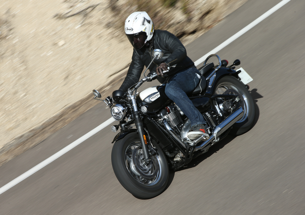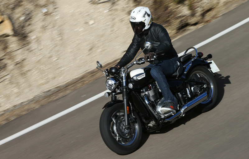 Le sospensioni hanno sempre poco escursione (è un vincolo imposto dal particolare telaio della moto), ma lavorano bene a patto di non entrare a cannone sulle buche e sulle sconnessioni della strada. Il manubrio è molto largo e le estremità ruotate all'indietro si rivelano comodissime nei lunghi trasferimenti, mentre tra le curve preferiamo il controllo offerto dal manubrio diritto. Il serbatoio da 12 litri è un po' più largo rispetto a quello della Bobber, ma la cosa è praticamente inavvertibile alla guida della moto di Hinckley. Guida che si conferma spassosissima tra i tornanti e le esse del Paese americano. Il peso è praticamente inavvertibile grazie al baricentro basso (e la sella dista solo 70 cm da terra), la Speedmaster è maneggevole tanto che non diresti mai di essere in sella a una 1.200. La spinta è possente dai 2.000 giri fino a oltre 5.000 giri, accompagnata da un sound pieno e corposo (non lo ricordavamo così bello nemmeno sulla Black). Non ci sono vibrazioni e anche cambio e frizione sono leggerissimi.