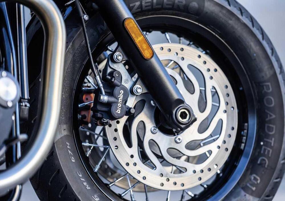 Il vero protagonista resta lui: il twin inglese da 1200cc che è una goduria assoluta. Un motore pieno, che spinge senza fare sconti, che dà tutto subito ma lo fa con un guanto di velluto. Rispetto alla Bobber, sulla Speedmaster tutto sembra più morbido, più ovattato, persino l'erogazione della vigorosa coppia di 106 Nm. Il motore è identico in ogni vite, ma c'è evidentemente una piccola differenza di setup elettronico e di risposta dei comandi. La mappatura non è identica a quella della Bobber: la Speedmaster non va mai di fretta anche se sa e può spingere. È fatta proprio per andare a spasso, per godersela, non per tirare la staccata. Nel caso però avessimo bisogno dei freni, troviamo adeguata assistenza: l'impianto frenante Brembo all'anteriore (doppi dischi da 310 mm) e Nissin al posteriore (disco da 255 mm), gestito dal nuovo ABS ottimizzato in curva sensibile all'inclinazione, si fa trovare pronto quando serve, offrendo sicurezza e progressione.