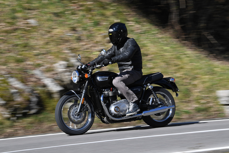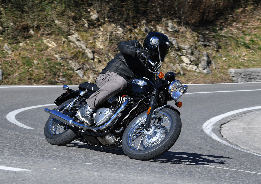 Ancor prima d’essere accesa, la T100 gratifica la vista e il tatto con finiture eccellenti. La cromature sono realizzate con grande cura, la plastica è per lo più bandita e i carter del motore sono in alluminio con una pregevolissima finitura spazzolata. Si trova tanta cura anche nei blocchetti elettrici e nella strumentazione, chiara e dotata del computer di bordo. C’è persino il conta marce. Il motore ha un bel sound sin dai bassi regimi e lavora assecondato da un cambio rapido e preciso. Il gas e la frizione sono leggerissimi anche nel traffico. Qui il peso si sente solo nelle manovre da fermo, ma la sella bassa rende tutto semplice. Il bicilindrico riprende dai regimi più bassi senza sussulti e ha una progressione splendida proprio dai 2 ai 5.000 giri. Oltre non serve andare. La T100 è suo agio in città, ma regala grosse soddisfazioni sui percorsi collinari. Qui sfodera una guida rotonda e fluida, con un impegno ridotto a zero. È comoda, non vibra e trasporta volentieri anche il passeggero sul morbido sellone. Le sospensioni, pur classiche, fanno il loro mestiere sui rattoppi dell’asfalto e anche l’impianto Nissin unisce una modulabilità esemplare alla giusta potenza. Logico che nei trasferimenti non si possano tenere alte velocità; quella di crociera ideale è di circa 110 km/h col motore che ronfa a 3.600 giri.