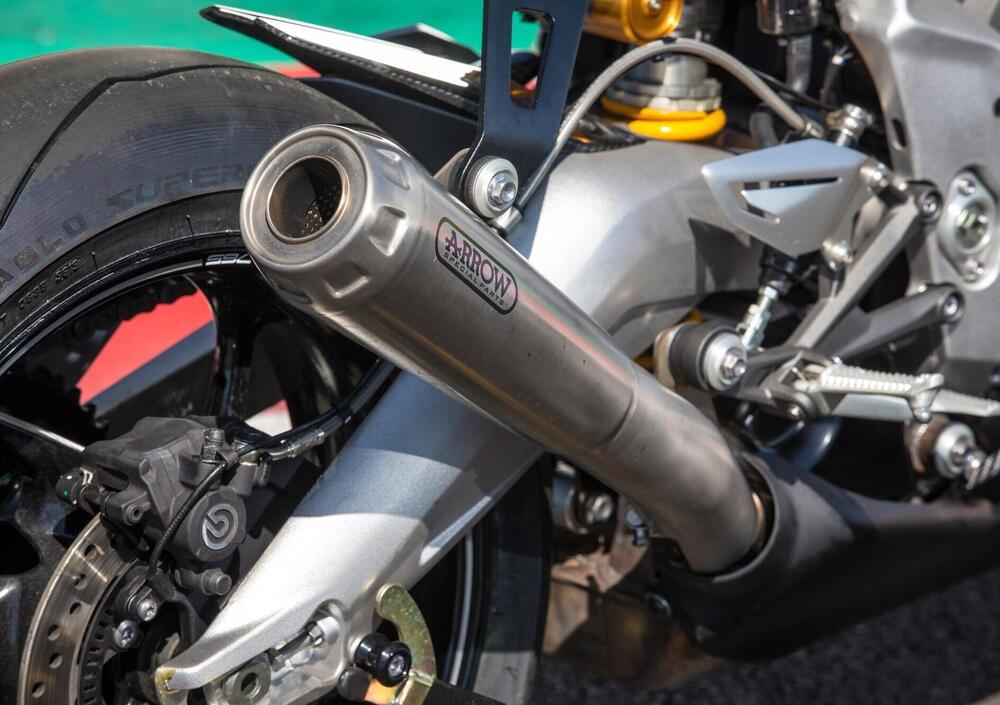 Alla spicciolata: assi a camme dal diverso profilo, pistoni più leggeri e resistenti, trattamenti DLC, valvole aspirazione in titanio, ma anche cornetti d’aspirazione, bielle, albero motore tutti nuovi oltre allo scarico in titanio Arrow. Un rapporto di compressione più elevato, e il risultato è un motore con più cavalli ma anche più “schiena” per un motore che riesce anche a girare più alto, arrivando a 13.250 giri.