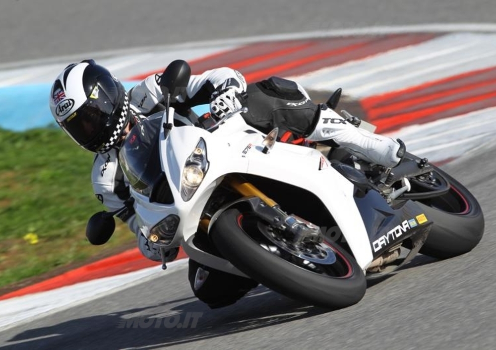 Stesso rapporto e apertura del gas uguale. Montare lo scarico aperto sulla 675R ha gli stessi effetti regalati dall'accorciamento dei rapporti (almeno un paio di denti di corona!). Sul rettifilo del traguardo il motore prende gli ultimi mille giri utili con estrema rapidità (con lo scarico di serie i tempi sono ben più lunghi) mentre in uscita di curva la moto sembra essere decisamente più brillante.