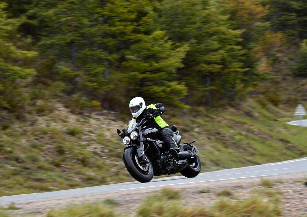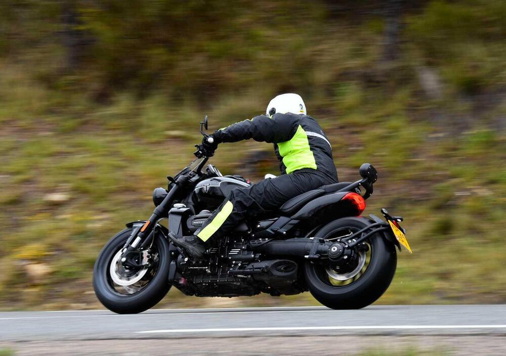 Che vogliate la Storm R o la Storm GT la sostanza da cavalcare non cambia: si ha a che fare con un motore mostruoso, di 2.458 cc i cui pistoni hanno un alesaggio esagerato da 110,2 millimetri e nel loro scorrere regalano un tamburellare di un ritmo tribale unico. La coppia massima di ben 225 Nm si raggiunge già a 4.000 giri ma ciò che è ancora più magico è che non c'è mai bisogno di "salire" fino a 4.000 giri. Per intenderci in sesta marcia a 3.000 giri siamo a 130 km/h. A quel punto se si apre si ha un'ulteriore spinta per lasciare sul posto qualsiasi occasionale avversario. Nonostante questi dati, la Rocket 3 ha un'erogazione vellutata e morbida che la rende molto più semplice e "umana" da usare di quanto non si pensi. Superato l'imbarazzo iniziale di avere a che fare con una moto da 320 kg in ordine di marcia (317 la R), si scopre che è una moto fatta per le curve al contrario del luogo comune che vorrebbe le cruiser adatte soltanto alle highways. Danza in cambi di direzione molto più svelti di quanto si supponga da fermi grazie ad una ciclistica di altissimo livello e un grande equilibrio. Ci si appoggia all'infinita gomma che si dispone con un anteriore da 150 mm ed un posteriore da appena 240 mm di battistrada... Praticamente quello di un'auto sportiva. Le sospensioni di carattere sportivo e completamente regolabili manualmente non offrono una grande escursione per cui non vanno d'accordo con dossi e buche ma quando la strada è buona regalano un feeling impeccabile. Anche il comparto freni è davvero notevole perché per fermare questo gigante bisogna poter contare su potenza e progressione e l'impianto Brembo con pinze anteriori ad attacco radiale Stylema fanno esattamente questo. Considerato il genere di moto e il passo lungo si usa molto anche il freno posteriore e lo si fa proprio serenamente. La Rocket 3 però non è una moto da guidare con i freni in mano, ma solo stuzzicando il motorone e sfruttando il freno motore accompagnati in rilascio da questo tamburo ancestrale. A proposito di sound va detto che con gli scarichi di serie è estremamente civile e ovattato lasciando il piacere soltanto a chi guida senza infastidire il passante. Tanta esuberanza meccanica è ovviamente un po' assetata, anche se non in maniera estrema: durante il nostro test abbiamo stimato un consumo di sette litri di benzina ogni cento chilometri. Ecco perché benché il serbatoio sia da diciotto litri le soste dal benzinaio potrebbero essere abbastanza frequenti.