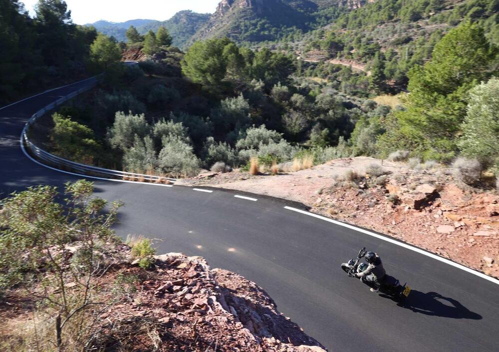 Nonostante l'attitudine anche fuoristradistica tra le curve la Scrambler 400 X sa assolutamente dire la sua. Il cerchio da 19 la rende un po' meno agile rispetto alla gemellina Speed 400, ma è anche questione di abitudine, la Scrambler rimane in tutti i casi una moto molto agile e con una triangolazione manubrio/sella/pedane ben studiata. Le pedane sono state abbassate per consentire una posizione più naturale in fuoristrada e nonostante ciò non abbiamo avuto particolari problemi nella guida dinamica su strada.