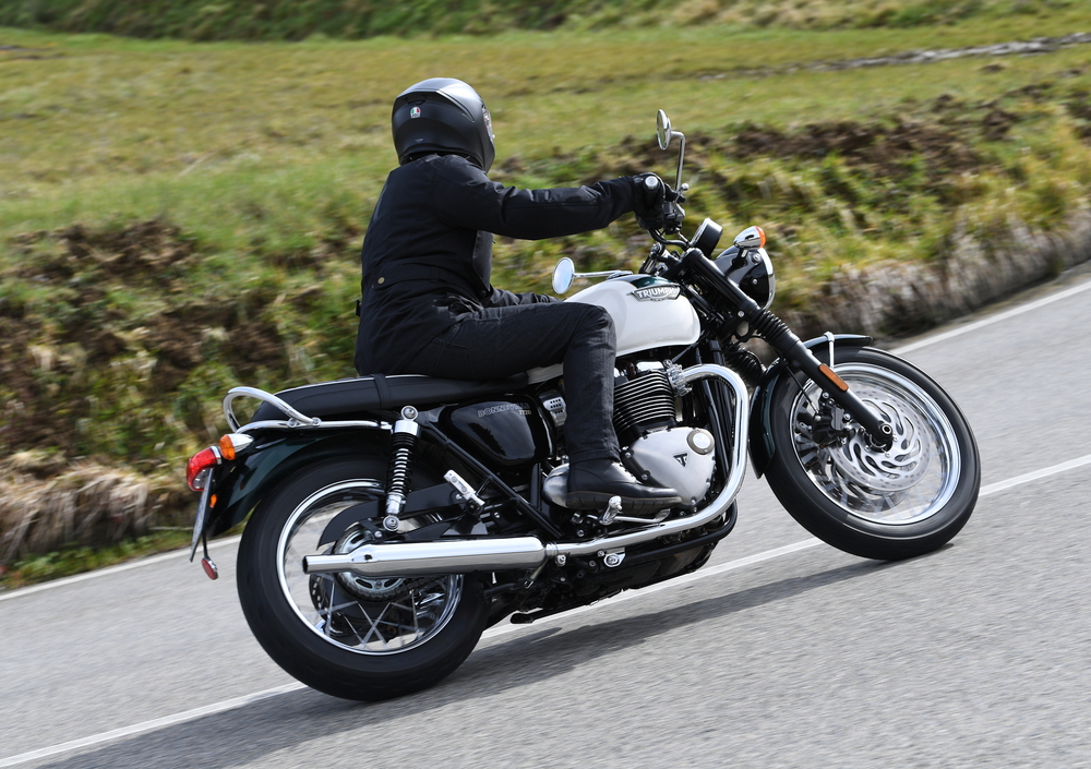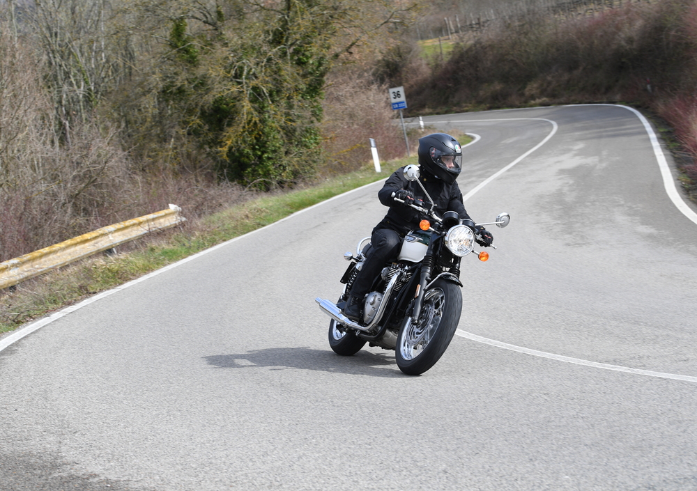 In percorrenza, le vibrazioni sono quasi nulle e si sentono soltanto a regimi alti, ma è improbabile che vi ritroviate a spingere ad alte velocità con questa T120, un po’ perché non è una moto che porta ad andare veloci, e un po’ perché, sopratutto nel misto, quando il ritmo si fa più sostenuto, l’avantreno diventa pesante.