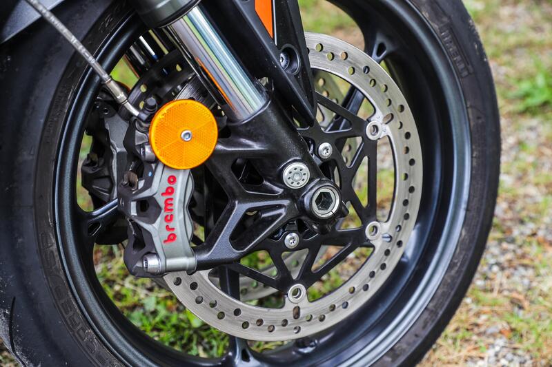 L'impianto frenante è di prim'ordine: a frenare l'inglesina ci pensano due pinze monoblocco radiali Brembo Stylema a 4 pistoncini, azionate da una pompa radiale Brembo MCS. Dischi anteriori da 310 mm e cornering ABS completano il sistema frenante.