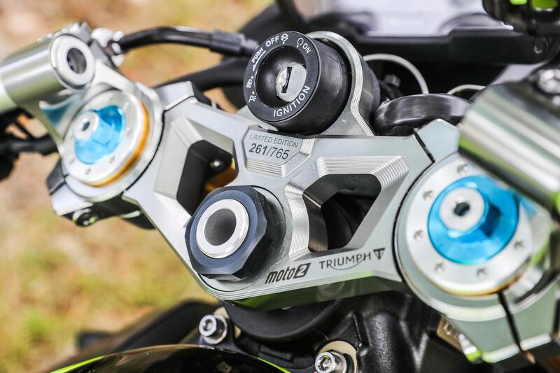 Disponibile in 765 esemplari per colorazione, la Moto2 Edition si differenzia dalla gemellina Street Triple RS principalmente nella ciclistica. Assomiglia in tutto e per tutto a una Moto2. La forcella (in questo caso andrebbe scritto con la lettera maiuscola) è una Öhlins NIX30 a steli rovesciati con smorzamento della compressione, dell'estensione e precarico regolabili, mentre al posteriore la Moto2 Edition monta un monoammortizzatore Öhlins STX40 con serbatoio separato, amorzamento dell’estensione, della compressione e precarico regolabili. Insomma, ve la potete cucire addosso per ogni occasione.