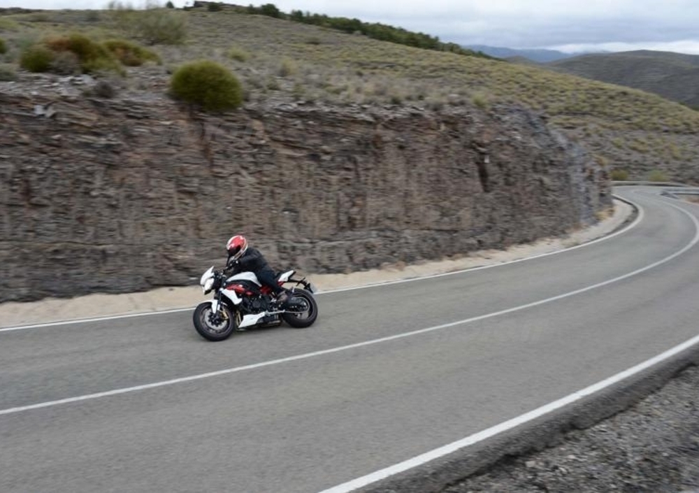 Precisa in inserimento, con un motore che sin dai medi ti tira fuori dalle curve come una fionda, la Street Triple è davvero appagante da guidare, e molto ben equilibrata. Le condizioni meteo non proprio favorevoli, nuvolo al mattino, pioggia debole al pomeriggio, con temperature che variavano dagli 8 ai 14°, ci hanno permesso di saggiarne le qualità anche in condizioni di aderenza non ottimali, e ne è emerso un comportamento dinamico molto sicuro. Anche le Pirelli Diablo Rosso Corsa di primo equipaggiamento ci hanno messo del loro, ma che la Street possa contare su un abbinamento motore/ciclistica ottimale, è fuori di dubbio.