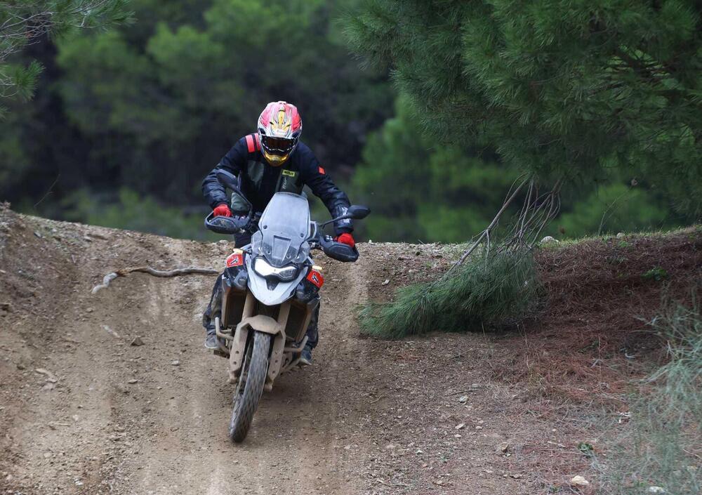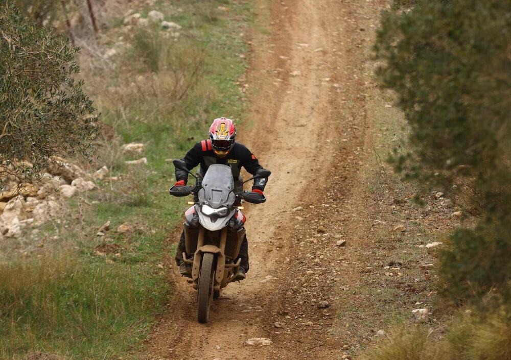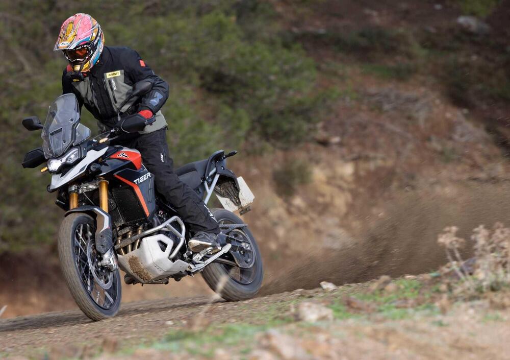L'avantreno è più caricato rispetto ad alcune rivali bicilindriche, di contro la stabilità è eccellente anche ad alta velocità. Saggia la presenza del riding mode Offroad Enduro Pro, che disabilita l'ABS dietro e il controllo di trazione. In questo modo basta un click per trasformare la Triumph Tiger 900 Rally Pro in un'ottima maxi enduro da fuoristrada. Di cosa è capace ce lo mostra Ivan Cervantes (lo vedete nei primi secondi del video al mio fianco in moto), ma la Tiger è adatta anche a chi si avvicina al tassello grazie all'equilibrio della ciclistica e alla regolarità del motore.