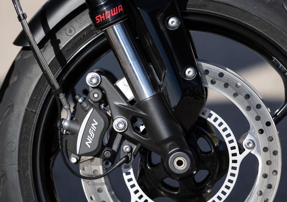 La moto scende in piega con una naturalezza, sostenuta da un assetto Showa che, pur essendo votato al comfort, in particolare la forcella, rende piacevole la guida.