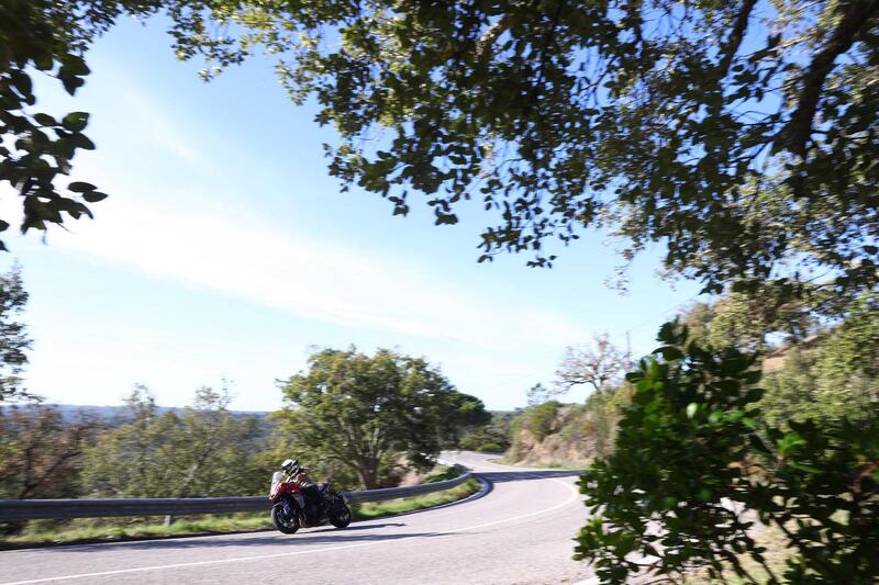 La voce allo scarico è bella e grintosa, la risposta all’acceleratore precisa, pastosa e quasi analogica nel feeling. Scartiamo subito il riding mode Rain, che attenua davvero troppo la risposta (considerato il grip dell’asfalto portoghese) e rende eccessivamente apprensivo il controllo di trazione, e iniziamo a fare conoscenza con la Sport 660.