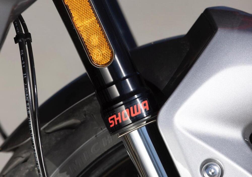 Invariati invece i cerchi a cinque razze in lega d’alluminio da 17”, calzati Michelin Road 5 nelle misure 120/70 e 180/55. L’impianto frenante, tutto Nissin, conta su un doppio disco anteriore dal diametro di 310 mm, lavorato da pinze a doppio pistoncini, e un disco singolo da 255 mm al posteriore con pinza monopistoncino, naturalmente gestito dall’ABS.
