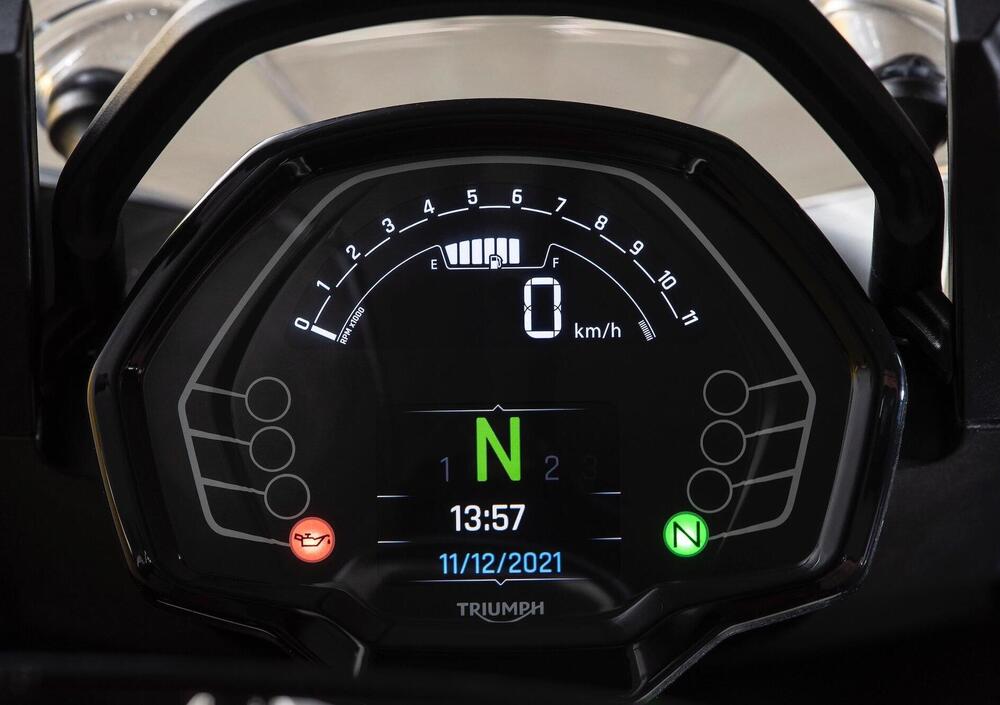 Il cruscotto TFT a colori è una variante meramente formale di quello che equipaggia la Trident, con connettività My Triumph che supporta navigazione semplificata turn-by-turn, controllo remoto della GoPro, ascolto della musica e gestione dello smartphone.