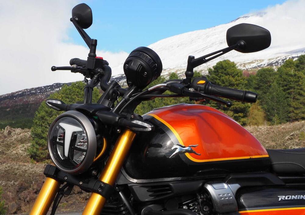 Buone notizie sul tema del peso che risulta di 160 kg in ordine di marcia con il serbatoio da 14 litri pieno al 90%, mentre la sella - larga e piatta - si piazza a 795 mm dal suolo; la luce a terra della Ronin è di 181 mm, un valore che permette comunque di percorrere strade sterrate senza timori di incresciose interferenze con pietre o radici, in ogni caso filtrate dal paracoppa in plastica di serie.