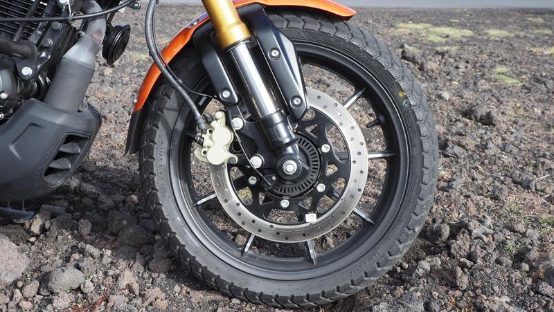 Sul fronte dell'impianto frenante troviamo un singolo disco anteriore da 300 mm con una pinza a doppio pistoncino parallelo, mentre dietro il diametro scende a 240 mm con una classica pinza a singolo pistoncino protetta da un elemento in plastica per evitare che detriti o terra possano interferire nel contatto tra pinza e disco, ovviamente presente l'ABS a doppio canale (come detto, a due modalità: la Rain più prudenziale della Road). Sui bei cerchi tubeless in alluminio troviamo pneumatici TVS Eurogrip Explo-R nelle - generose per la cilindrata - misure di 110/70 e 130/70.