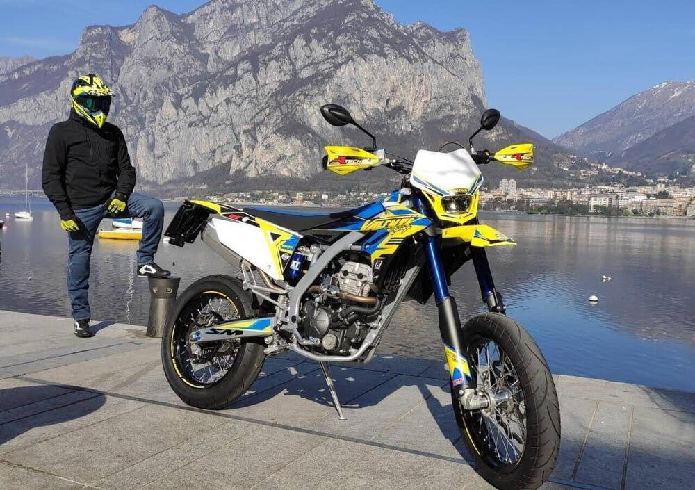 Il dimensionamento è europeo quindi e in sella si sta bene, nonostante questa sia bella alta e duretta. Il motore non vibra e ha un tiro tra i migliori nel segmento 4 tempi. E' lineare sotto e con un bell'allungo in alto. La SM Z è molto maneggevvole, con sospensioni Ollè a punto e un'ottima stabilità sul veloce. La frenata combinata (obbligatoria per legge) non delude ed è soprattutto molto ben modulabile. Le gomme Mitas, montate sui cerchi a raggi da 17 pollici, hanno un buon grip, ma richiedono di essere rodate e scaldate bene per alcuni chilometri prima di dare la massime prestazioni.
