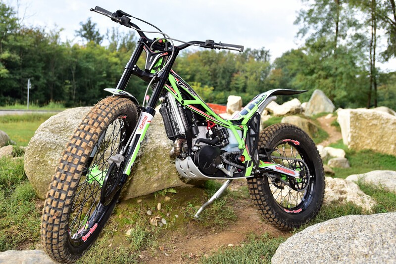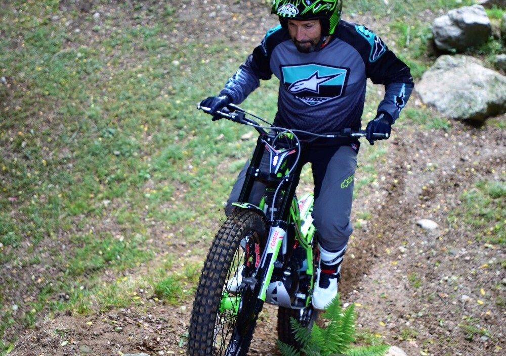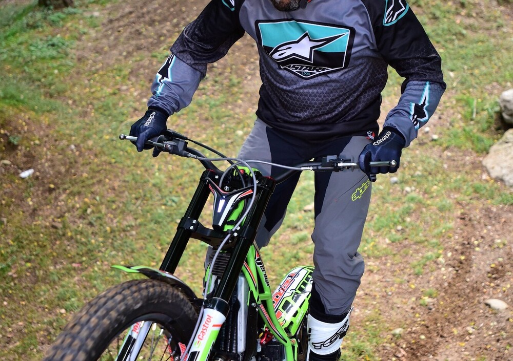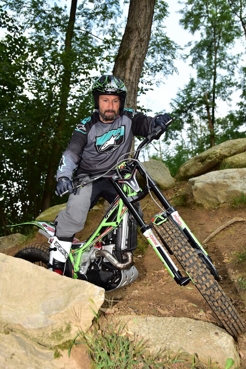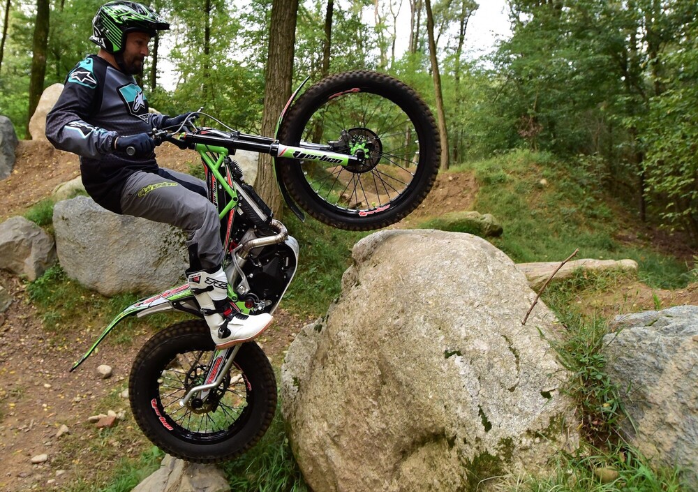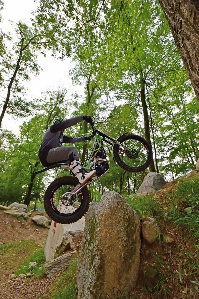 Slta immediatamente all’occhio il fatto che la moto parte senza dover più premere il pulsante di avvio/spegnimento, in questo caso il battery-less funziona a dovere insieme al nuovo pedale garantendo lo start al primo colpo. In movimento la moto è sensibilmente più leggera ed equilibrata, con sospensioni che scorrono già molto bene anche da nuove; il suono al solito cupo e pieno aumenta in fase di accelerazione dal respirare ora molto meno rumoroso della scatola filtro che libera da batteria ne aumenta la sua capacità volumetrica. Ciò che differenzia maggiormente la moto dalla sorella 2017 sono sicuramente l’assetto sospensioni, molto morbide e sensibili e l’erogazione del motore molto più pastoso e rapido ad ogni regime, migliorie tangibili che vanno ad aumentare il feeling con la moto e l’aderenza del posteriore che in ogni situazione si rivela essere molto sincero nella risposta alle asperità del terreno. Una peculiarità di questa moto è sicuramente la piacevolezza di guida che si riscontra su terreni smossi o pietraie, qui il mezzo mantiene sempre la traiettoria senza costringere il pilota a faticosi spostamenti per mantenere l’equilibrio, buona parte del merito deriva anche dall’erogazione del propulsore che grazie all’iniezione non ha mai incertezze, veramente un passo avanti questo sistema. Veniamo al consueto Test di verifica nelle classiche situazioni trialistiche: