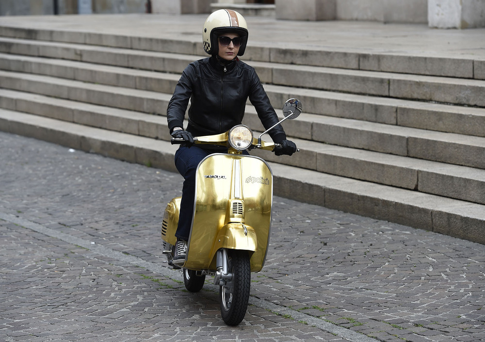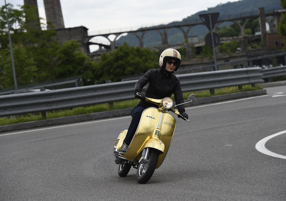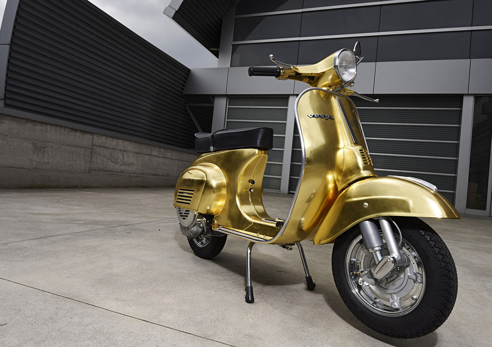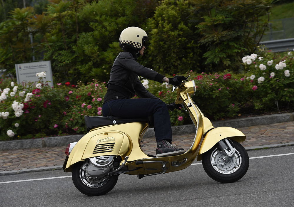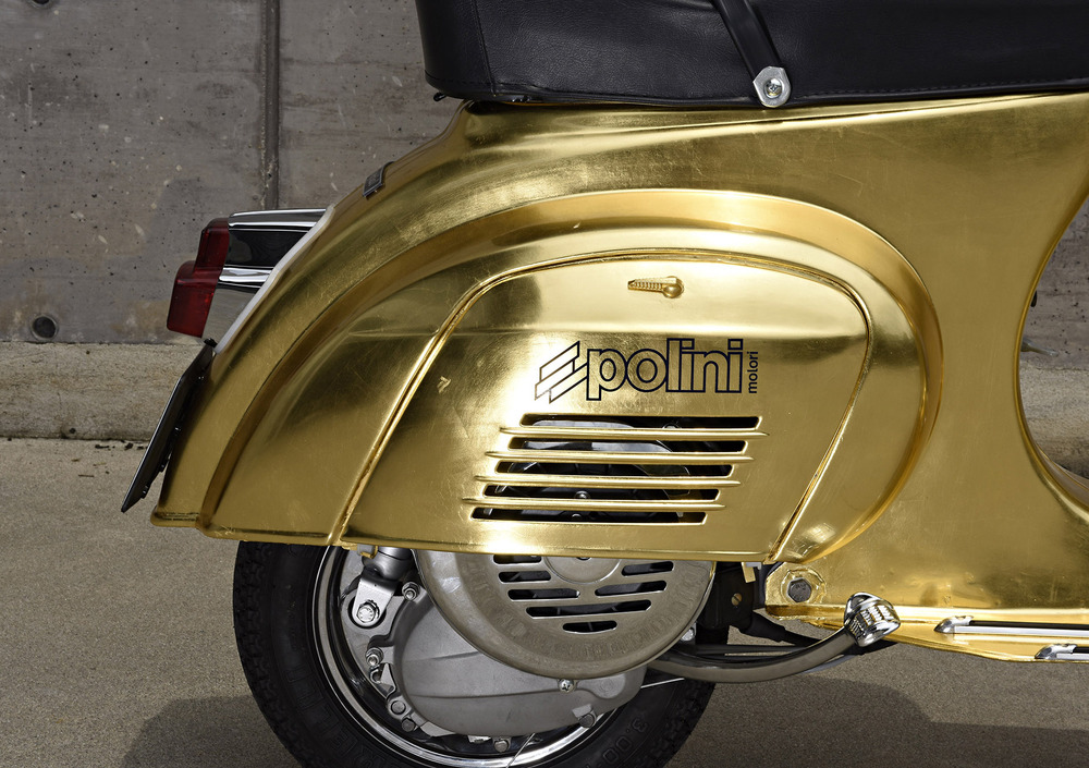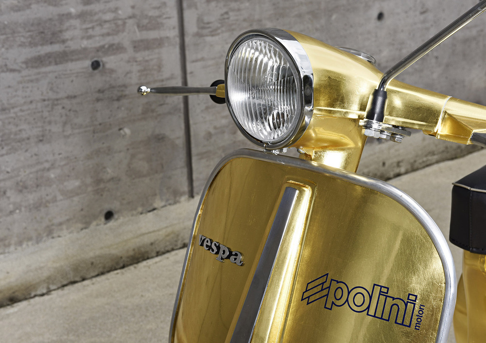 Da sempre amata, protagonista di film e canzoni, inconfondibile simbolo dell’Italia su due ruote e, in questa veste, accentratrice di sguardi e desideri grazie alle 500 foglie d’oro zecchino pazientemente posate a mano una ad una e poi ricoperte da una vernice trasparente atta a proteggere cotanta preziosità. Bella è bella, non si può dire altrimenti. Tutto quell’oro armoniosamente in contrasto coi profili cromati, la linea indiscutibilmente unica e poi ultima ma non ultima, la sapiente preparazione Polini, cuore pulsante di questo prezioso progetto.