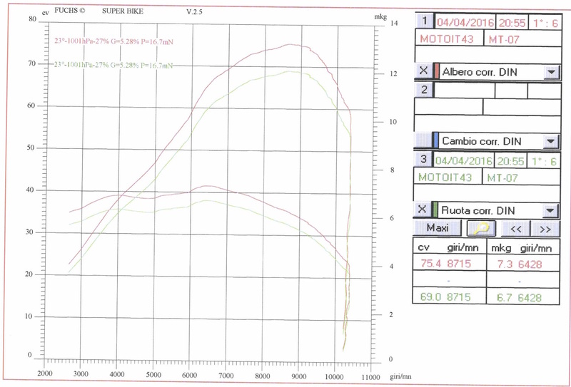 Molto bella anche la curva di coppia, piatta e dall’andamento regolare, che racconta da un punto di vista tecnico la robustezza dell’erogazione con un valore di picco di 7,3kgm all’albero che alla ruota si traduce in 6,7 chilogrammetri.
