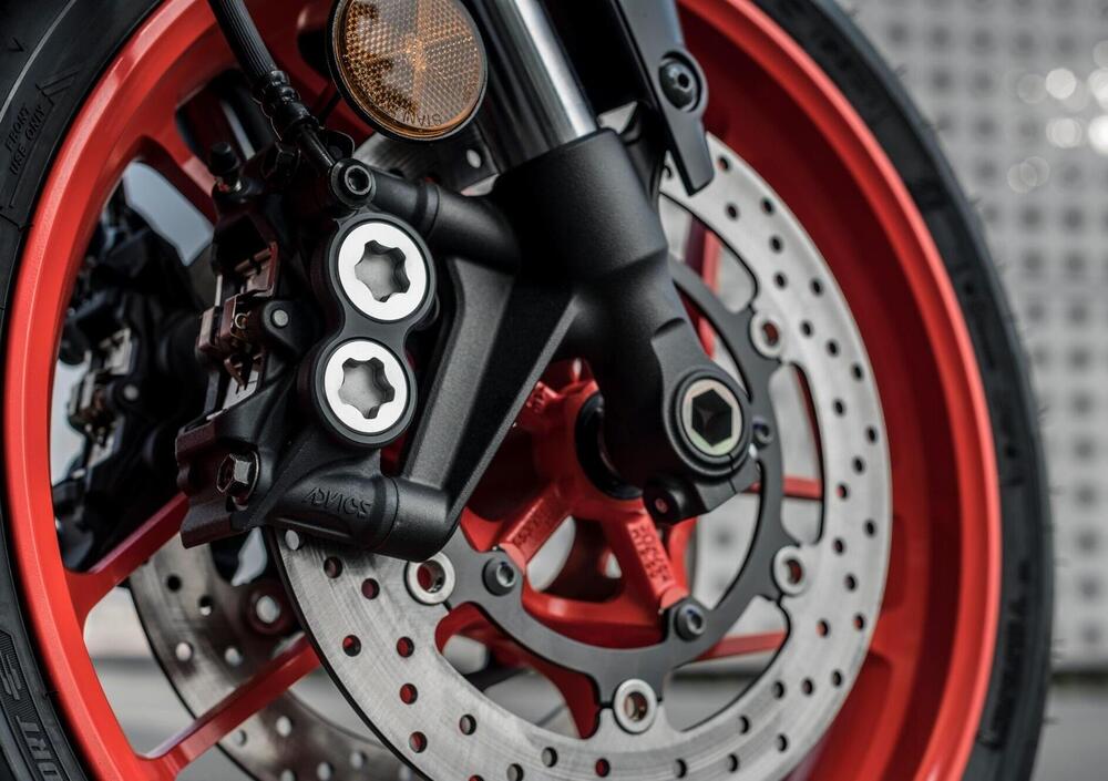 L'impianto frenante, come scritto sopra, è in parte condiviso con il modello precedente. In parte perchè, se le pinze Nissin a quattro pistoncini e i dischi da 298 mm sono identici, la pompa, sempre Nissin, è ora radiale. Al posteriore troviamo invece un disco da 245 mm con pinza a due pistoncini. L'ABS è stato sviluppato con Bosch ed è un attualissimo 9.1 MP con funzionalità Cornering.