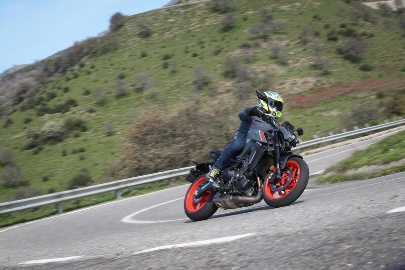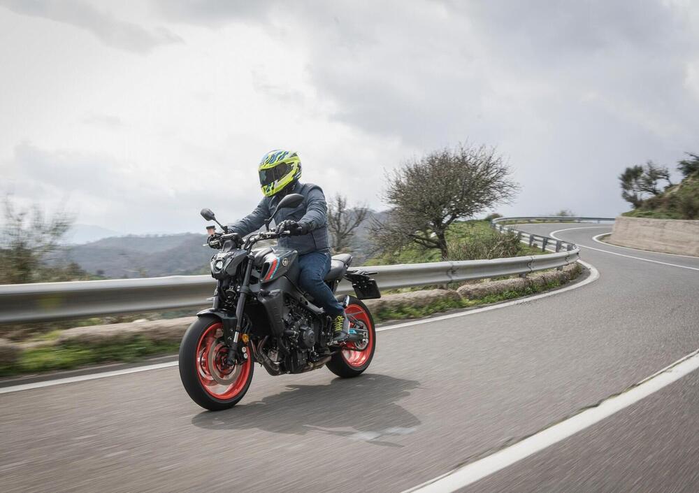 La posizione di guida è caratteristica sulla MT-09, busto eretto manubrio largo e sempre alto, pedane relativamente arretrate, quindi poco caricata sull'avantreno. Anche lavorando sulla posizione delle pedane e su quella dei riser del manubrio, cambia poco e questa è una scelta dei tecnici Yamaha. Si enfatizza così il concetto di fun bike. Anche guidando ci si accorge che lo stile più redditizzio non è quello tipico da naked sportiva, non ci si trova a proprio agio a buttarsi fuori dalla moto, il manubrio largo e la posizione delle pedane rendono questa pratica poco naturale, più facile spostare solo il busto e il casco verso centro curva e sfruttare la grandissima agilità della tre cilindri Yamaha.