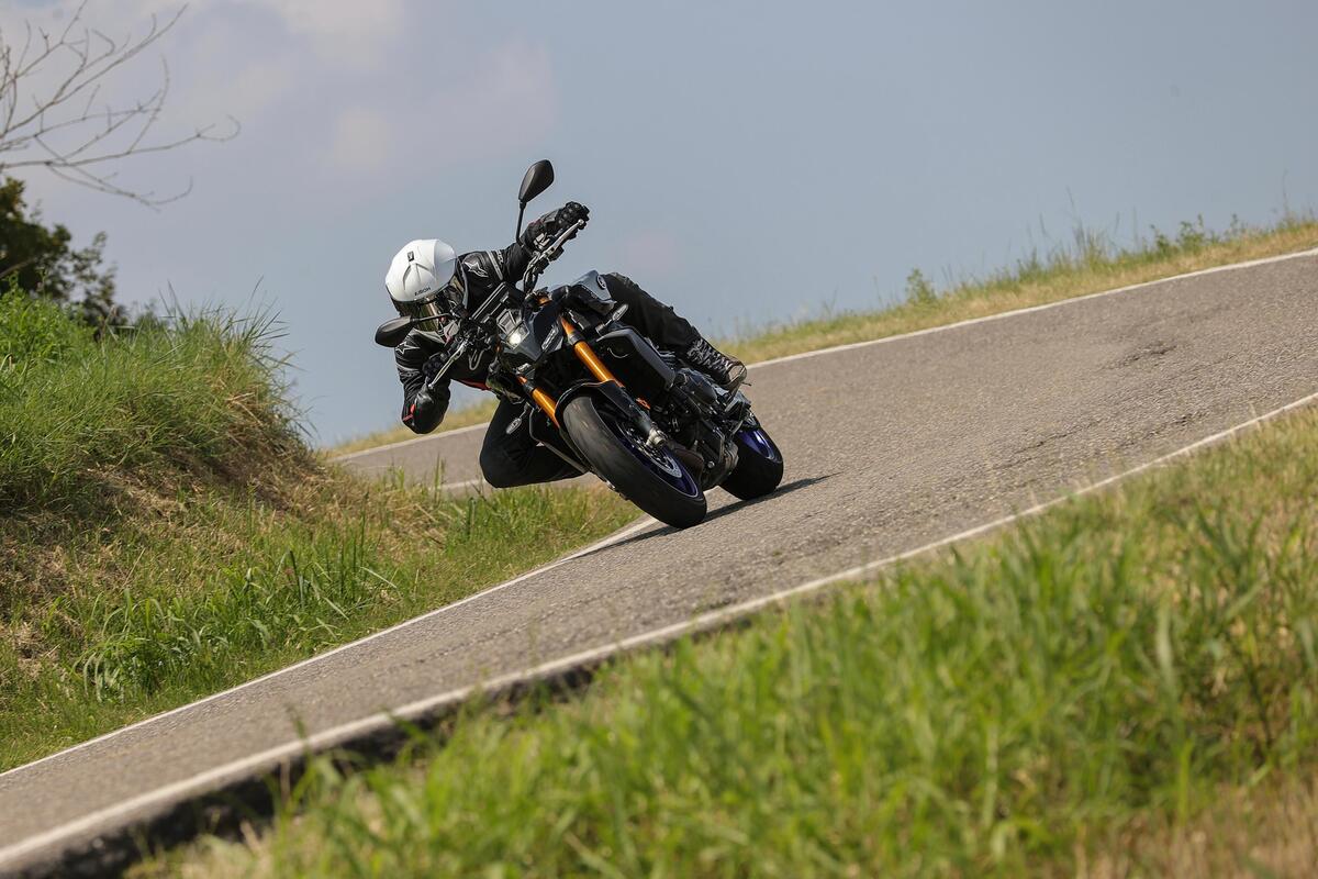 Appena si lasciano le strade urbane per affrontare percorsi misti con curve e cambi di ritmo, la MT-09 SP cambia natura. La ciclistica di alto livello conferisce alla moto una precisione e un feedback che si percepiscono sin dai primi tornanti. La risposta dell'anteriore è diretta e rassicurante, il retrotreno è agganciato all'asfalto con autorità. In setting sport, la SP diventa esplosiva: non vuole stare giù, letteralmente.