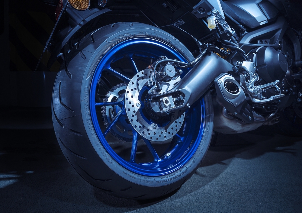 Non cambia nemmeno il cuore pulsante della MT-09, ovvero il tricilindrico CP3 da 847cc, con fasatura dell’albero a 120° ed intervalli di accensione regolari a 0º, 240º e 480º, nonché cilindri sfalsati, Il propulsore, dotato di distribuzione a 12 valvole e contraddistinto dal cambio sovrapposto al carter, è dotato di contralbero e coperchi teste in magnesio..
