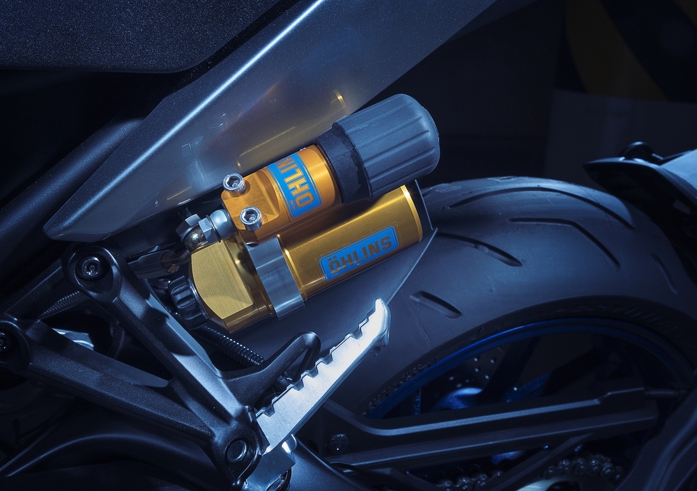 Al retrotreno troviamo invece un monoammortizzatore Öhlins RSA monotubo da 46 mm, completamente regolabile nell’idraulica e dotato di registro remoto per precarico e compressione. Da notare come sia al retrotreno che all'avantreno siano state usate molle dal "K" più contenuto rispetto alle unità montate sulla MT-09 - anche se nella seconda fase della progressione la forcella arriva a superare la versione standard - grazie ad un'idraulica più efficace nel fornire sostegno alla componente elastica. Invariata la ripartizione dei pesi, praticamente neutra, con un 50,2% sull'avantreno e 49,8 sul retrotreno.