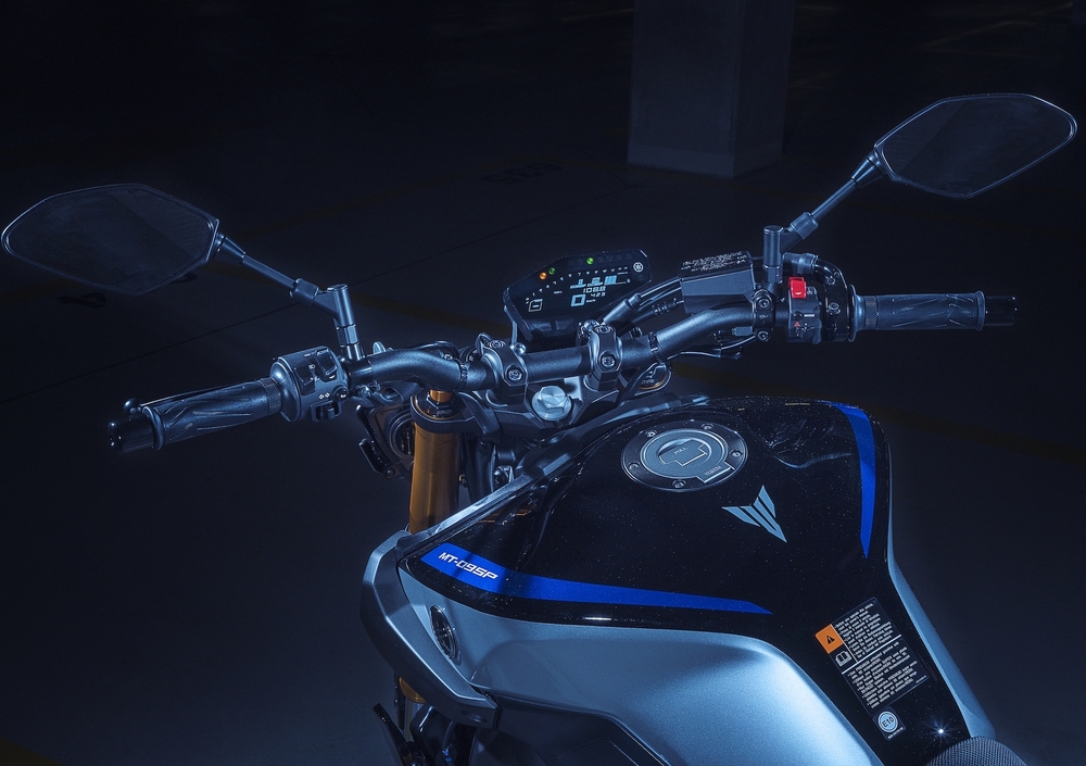 La strumentazione LCD, più attillata al cupolino, è la prima differenza della SP rispetto alla MT-09 standard: la grafica è a caratteri bianchi su fondo nero, per offrire una maggior visibilità e una linea più raffinata. Una connotazione estetica che fa il paio con il manubrio e i comandi, che riprendono la tonalità nera in un (riuscitissimo, a nostro giudizio) gioco di tono su tono.