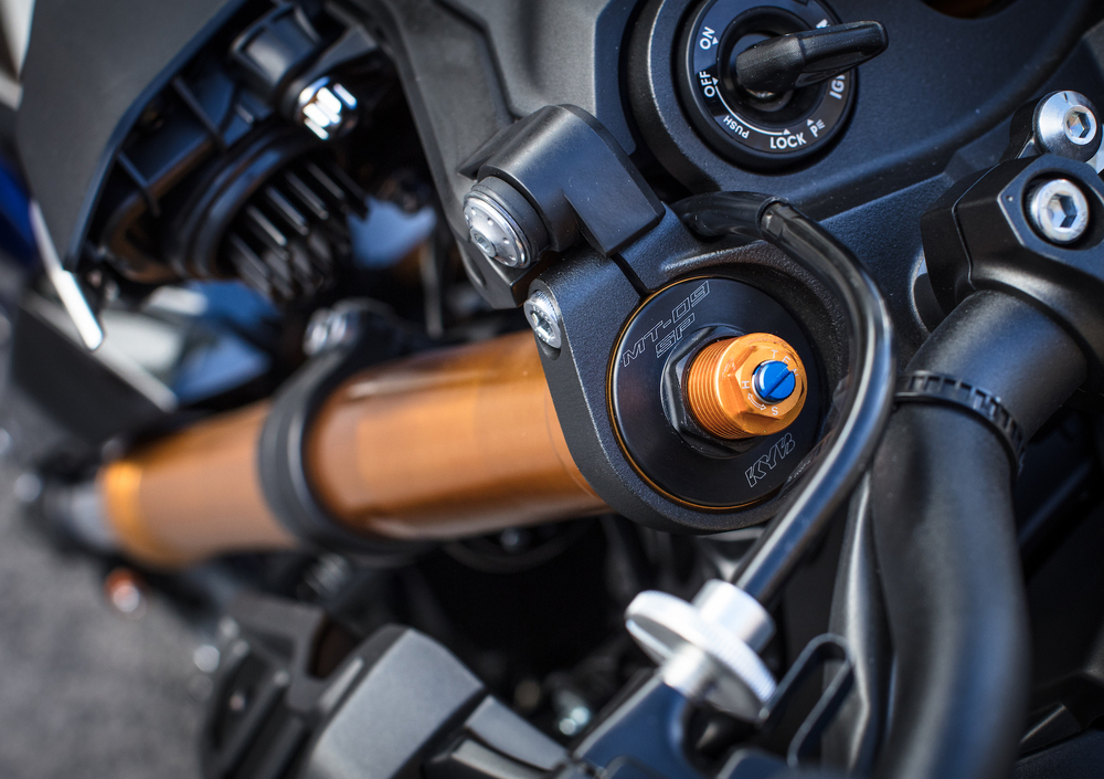 Qui troviamo le differenze più significative fra la MT-09 standard e questa versione SP. Fermi restando il telaio a doppio trave in alluminio, composto da due sezioni pressofuse pure in alluminio, e il forcellone asimmetrico con braccio destro a banana, il comparto sospensioni è decisamente più raffinato.