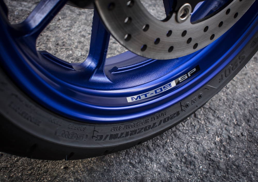 La Yamaha MT-09SP è in arrivo nelle concessionarie a 10.190 euro f.c. nella sola colorazione Silver Blu Carbon, che richiama evidentemente quella della MT-10SP. Troviamo quindi il serbatoio con fianchi in argento e sezioni superiori blu/nere con logo Yamaha in 3D; da notare come tutte le verniciature siano riportate sulle sovrastrutture senza soluzione di continuità, quindi senza i "rigonfiamenti" tipici degli adesivi. Cupolino e codino sono anch’essi in argento, mentre il parafango anteriore ha una finitura blu/nera con grafiche SP.