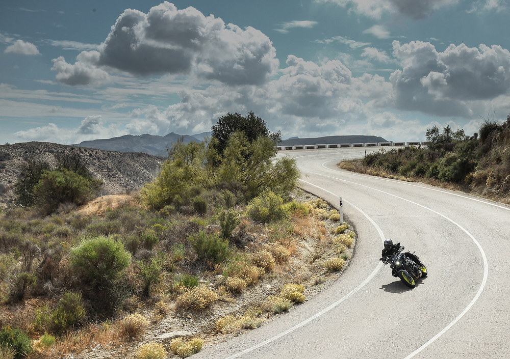 Mai impegnativa, a meno che non consideriate la strada come una pista e ogni frenata come l’ultima staccata prima del traguardo, la MT-10 riesce a soddisfare tutti quanti. Docile e mansueta, si muove tra le curve con grande agilità, e solo se istigata mette in mostra una certa inerzia nei cambi di direzione più repentini, caratteristica che troviamo anche nella R1 e che è legata sia al baricentro piuttosto alto, ma soprattutto alle inerzie dovute all’albero motore, caratteristiche di questo motore a scoppi irregolari.