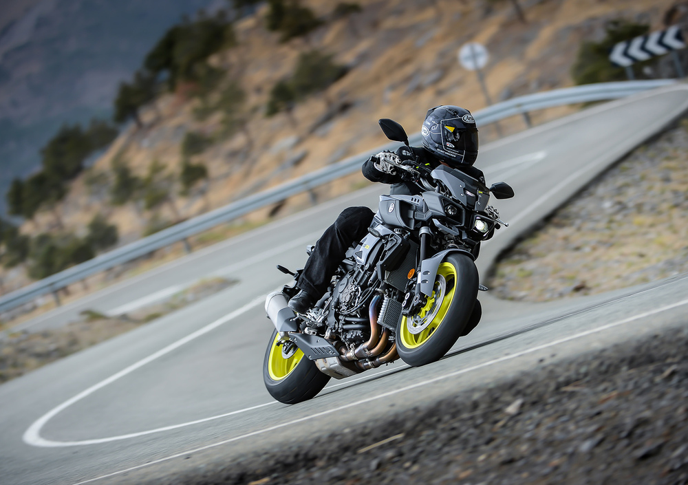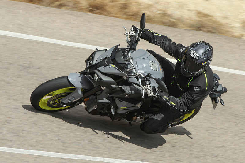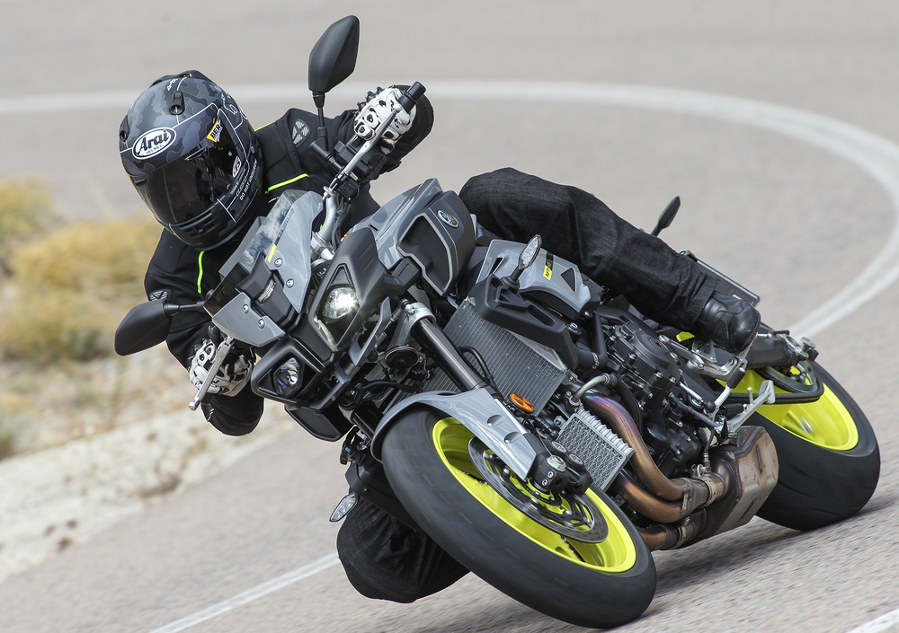 Spinge forte e spinge sempre, questo motore, esaltato da una ciclistica che é una sorpresa, perché con un interasse così corto ci saremmo aspettati un comportamento più nervoso e imprevedibile. Alla prova dei fatti, invece, la MT-10 si rivela un compasso in curva e anche sul dritto appare stabile e precisa. L’equilibrio tra le prestazioni del motore e il comportamento della ciclistica in generale sono entusiasmanti: facile e precisa, andando a spasso con un filo di gas la MT-10 sa essere una perfetta compagna di lavoro quotidiana, ma all’occorrenza, e solo su richiesta, si trasforma in un missile terra-terra che potrebbe istigare il pilota a guidare molto sopra le righe!